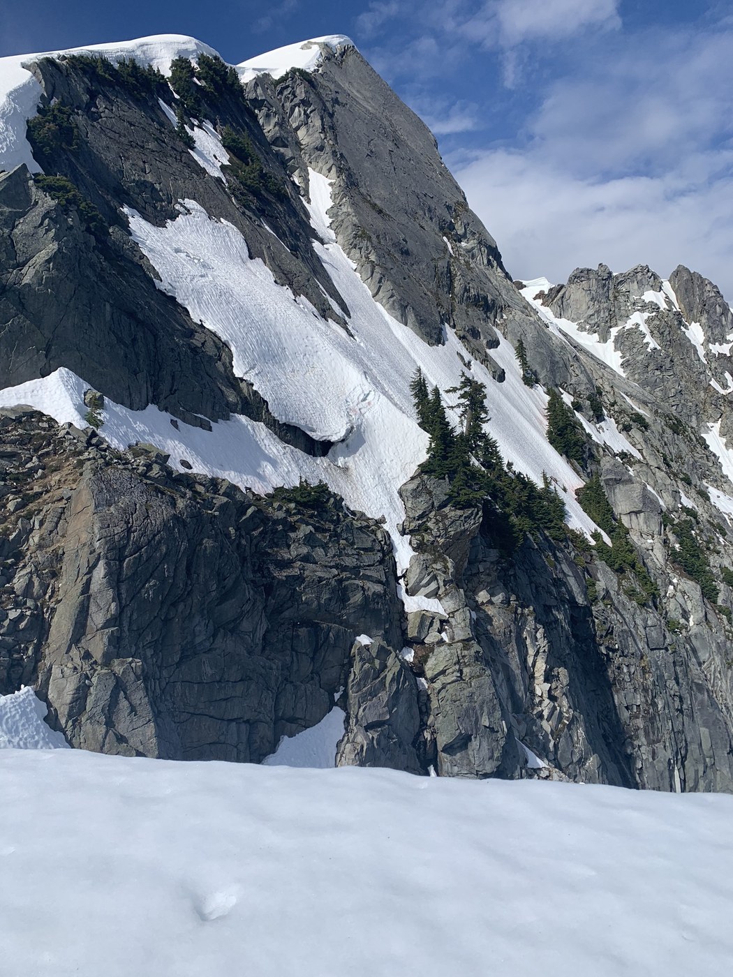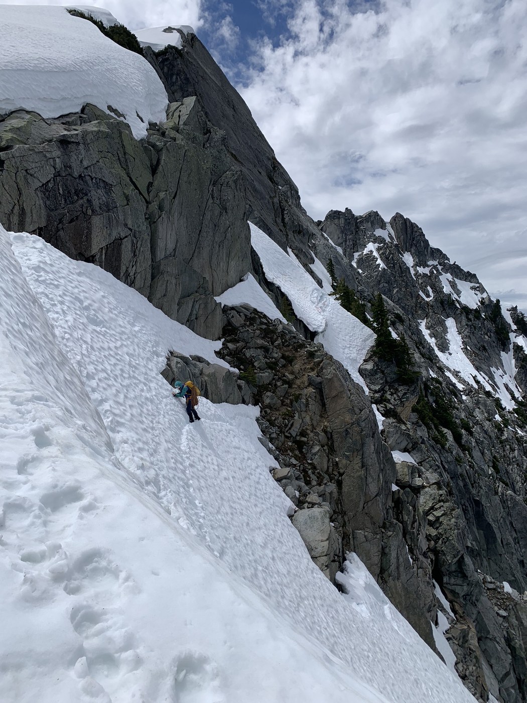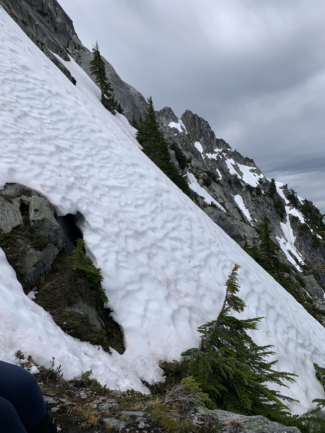 Third water crossing was a bit sketch, were able to keep our feet dry, poles were nice to have. Snow starts at the gulley headed up to Headlee Pass then clear after the pass until just before the lake outlet, then snow to the summit. Attempted to climb Ragged Edge, the traverse is snow covered. Doable if you are comfortable with steep snow travel…recommend pickets to protect the traverse as a fall could be fatal. We turned around half way through the traverse since we didn’t have pickets, there were minimal trees we could sling. Rock route looked clear though. Bring bug spray!