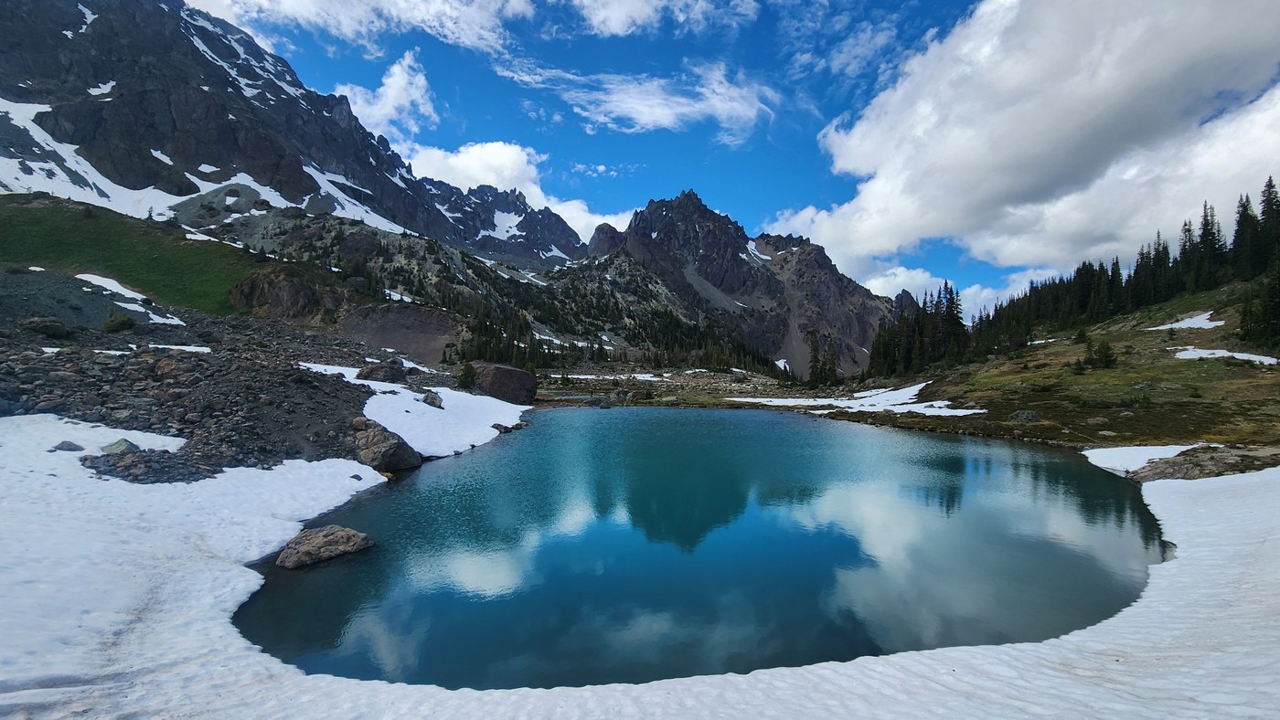 Minor creek crossing then snowfields that lead up to the upper tarn/lake which is nearly fully melted out.