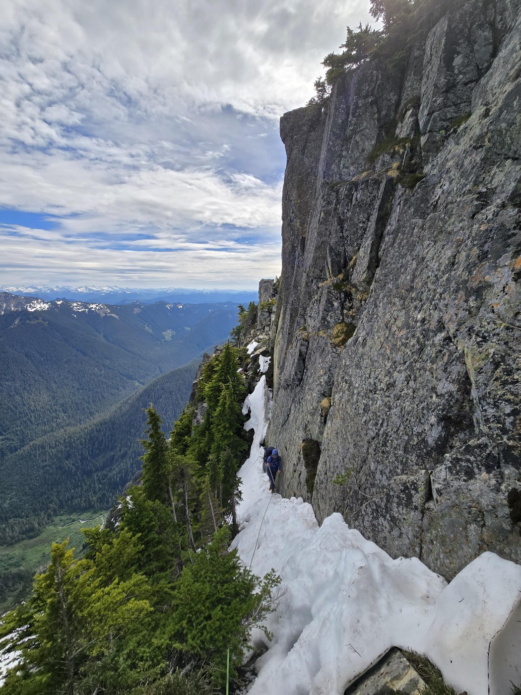 I added a photo of the northern ledge below the summit of Gunn that AntonC mentioned. Some of our worst post holing was here, where we’d punch through between the snow and the rock up to our knees.