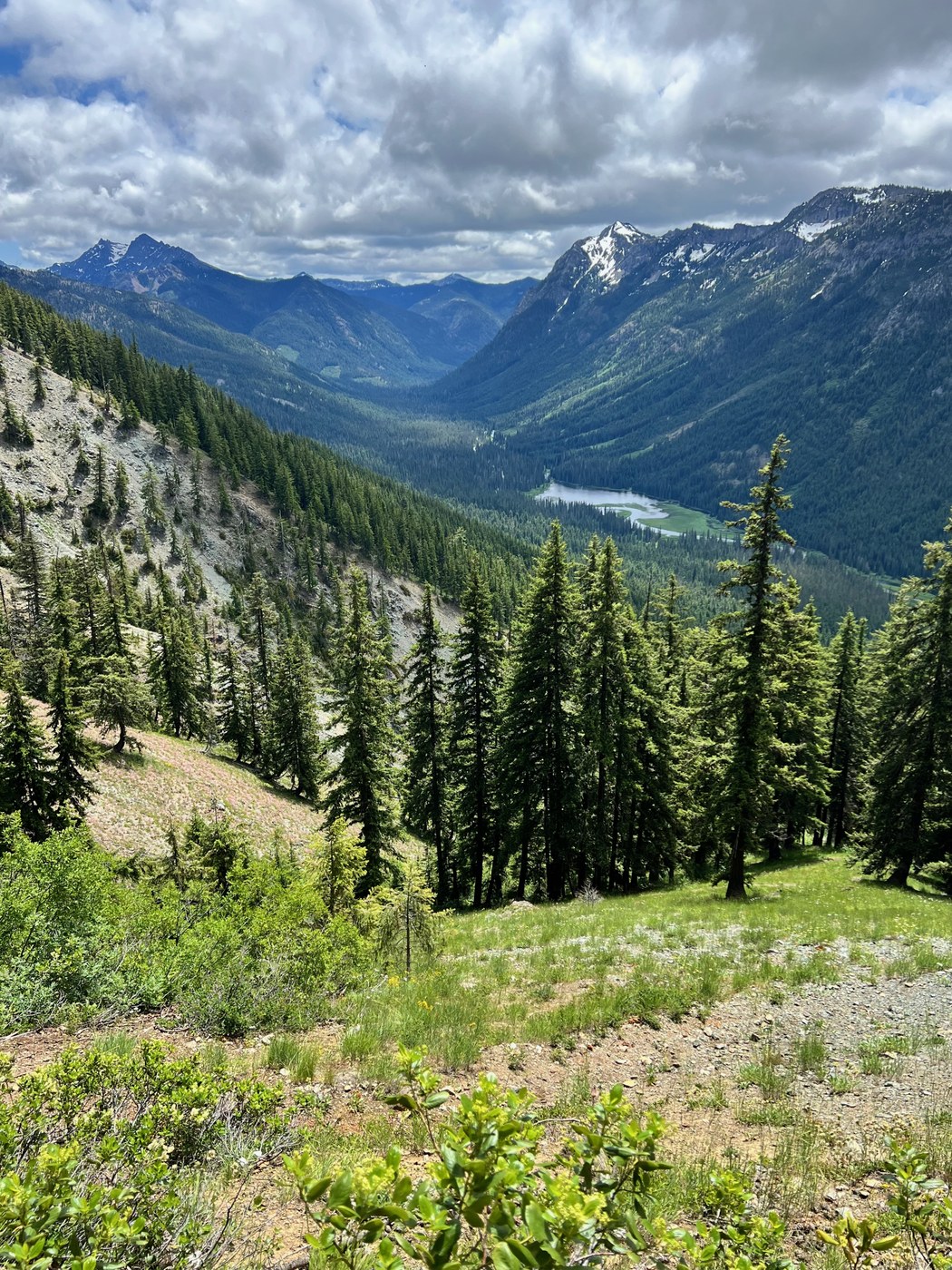 By a third of the way through it opens up in to massive every grander views of the river valley. The Mt. Daniel mastiff grows larger above the opposing ridge and everywhere classic glaciered snow capped peaks come into view. There are the hardest blowdowns to get by in this section but they are all manageable, a few requiring a bit of balance and gymnastics.