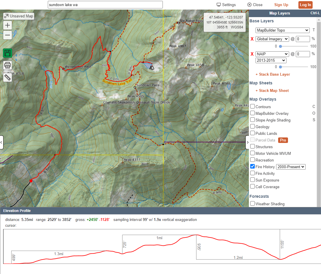 The problem here seems to be in the name itself; The "Sundown Lake Trail" labeled on the map shown above is not the "Sundown Lake Way Trail" (nor is it even the Sundown Lake Trail). In fact, the trail shown is the Wynoochee Pass Trail (completely separate from Sundown Lake or Sundown Lake Way Trails). That trail is a tough hike but it's easily followable.