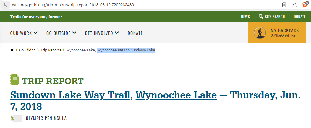 Excellent point about the naming issue. I wonder if things were right in the past and then something got changed incorrectly. On the Hike Finder map, the entry for "Sundown Lake Way Trail" shows up where the "Wynoochee Pass Trail" should be. Additionally, old trip reports have contradictory information about whether they're discussing "Sundown Lake Way Trail" or "Wynoochee Pass to Sundown Lake"