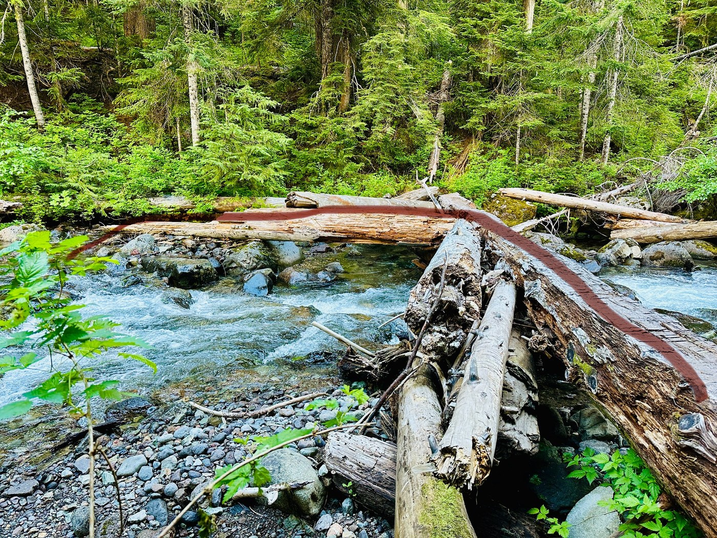 Nickel Creek Crossing: As the MORA trail condition site states, the old bridge has moved further downstream since last season. Recommendation would be to start on the old bridge. Then take the large deadfall to the creek bed. See pic.