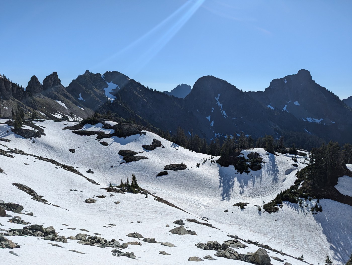 The trail up to Lake Lillian is shorter and less brutal than I remember, but by no means kind. No notable obstacles, and totally snow-free up to the very edge of the lake. It looks like the one campsite by the outlet (to the west when approaching the lake from downhill) is totally melted out. But also I saw a couple backpackers heading in as I was on my way out, so it might well be occupied by now.