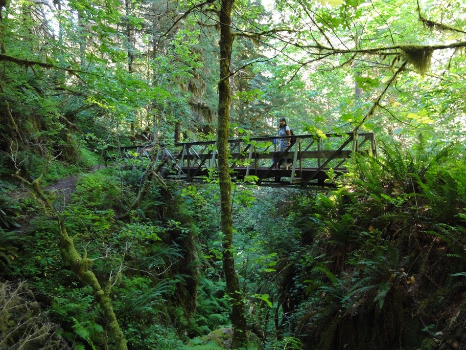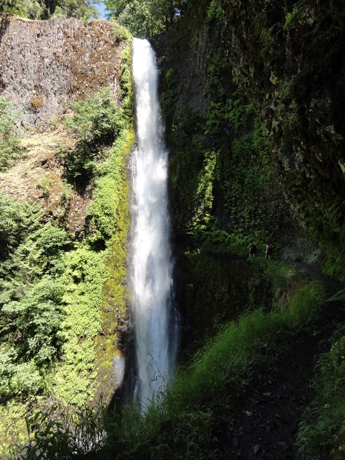 I had heard the Eagle Creek trail was one of the most spectacular hikes in the Columbia River Gorge and a great hike for seeing waterfalls. Well, that was no lie. The Eagle Creek trail is amazing. Unfortunately, it’s also one of the more popular hikes in the Columbia River Gorge. Our goal was to hike to Tunnel Falls which is about 12 miles out-and-back. We went on a weekday hoping to avoid the crowds. We arrived at the trailhead around 9:30 am and were happy to see the parking lot wasn’t too crowded. Overall, the trail was moderately difficult but mostly level with a few rocky areas. I was a little worried about how our dog would do on a 12-mile hike, but other than making sure he had enough water, was on a leash and stayed on the trail, there were no problems. Large sections of the trail are very narrow and literally carved into the basalt cliff with cable hand grips fastened to the cliff to help hikers stay on the trail. I had heard numerous reports of people or dogs falling off the trail and now I see how easy that would be. At 1.5 miles we saw Metlako Falls on the opposite side of Eagle Creek and at 2 miles, we came to Punch Bowl Falls which was accessible from a side trail. Punch Bowl Falls is beautiful and very photogenic but can be a challenge to get a photo without people in it. Luckily that wasn’t a problem this time. At 3.3 miles up the trail we came to High Bridge which crossed over the narrow gorge about 150 feet above Eagle Creek and offered a stunning view of the gorge and creek below. A little further up the trail we passed a sign that described a fire that swept through the area in 1902. According to Wikipedia, it’s thought the fire was started by some boys trying to burn a nest of hornets. The fire spread and eventually became a part of a fire complex named the Yacolt Burn which burned about 239,000 acres and caused at least 65 deaths. At 5 miles we came to a sign saying we were about to enter the Mark O. Hatfield Wilderness in the Mount Hood National Forest and we needed to obtain a permit before entering the wilderness. We continued for about 2 miles and reached Tunnel Falls at around 2 pm which meant it took us about 4 hours to reach the falls. At a height of 172 feet, Tunnel Falls was spectacular. The trail was very narrow with a man-made tunnel that was blasted through the cliff behind the waterfall. There were quite a few people around the falls which made it difficult to pass on the narrow trail. We hung out for about a half hour taking pictures and enjoying the mist coming off the falls. I later found out there was another waterfall not too far up the trail called Twister Falls that I wish we had seen. But I guess that leaves something for the next time.