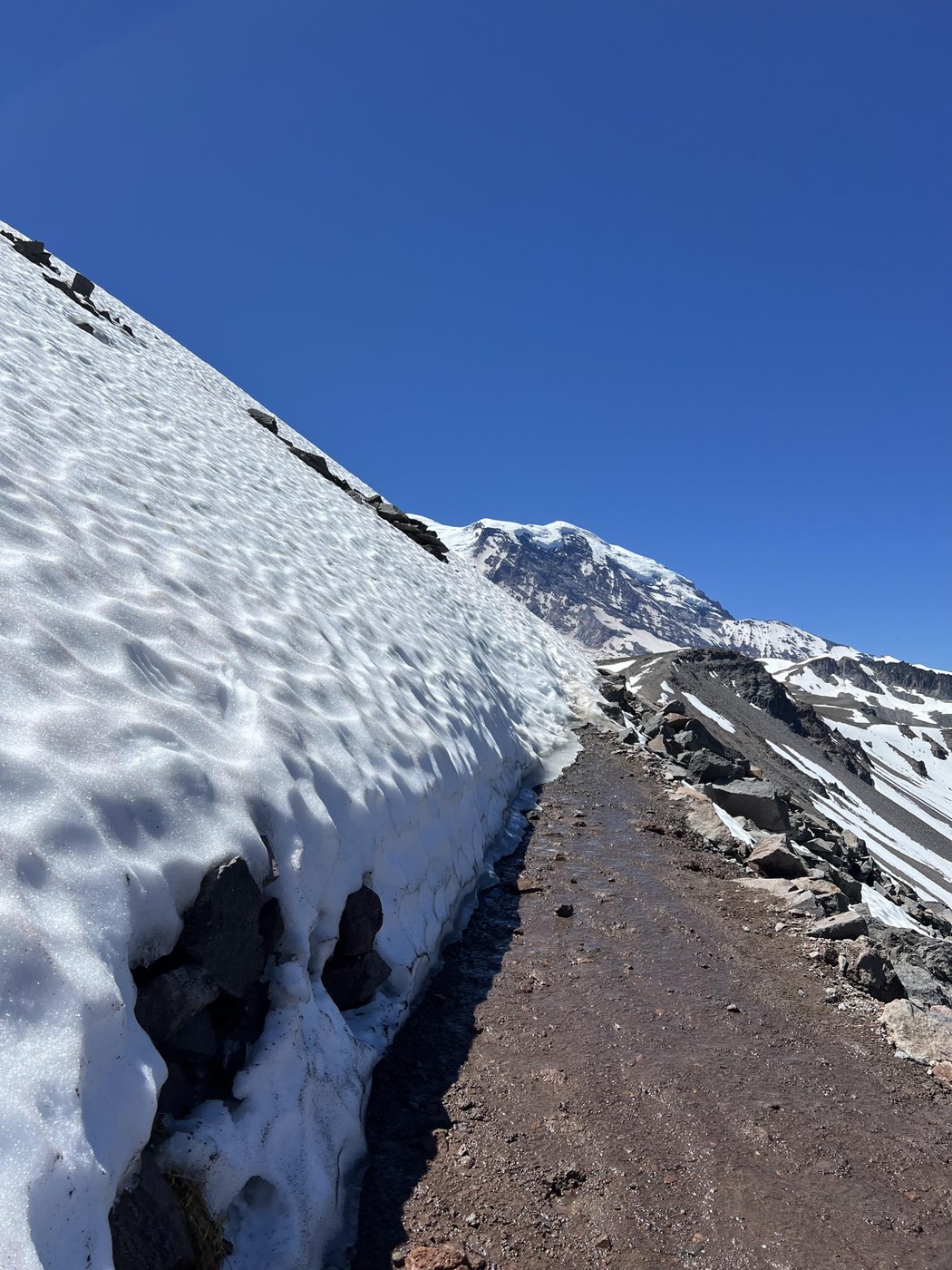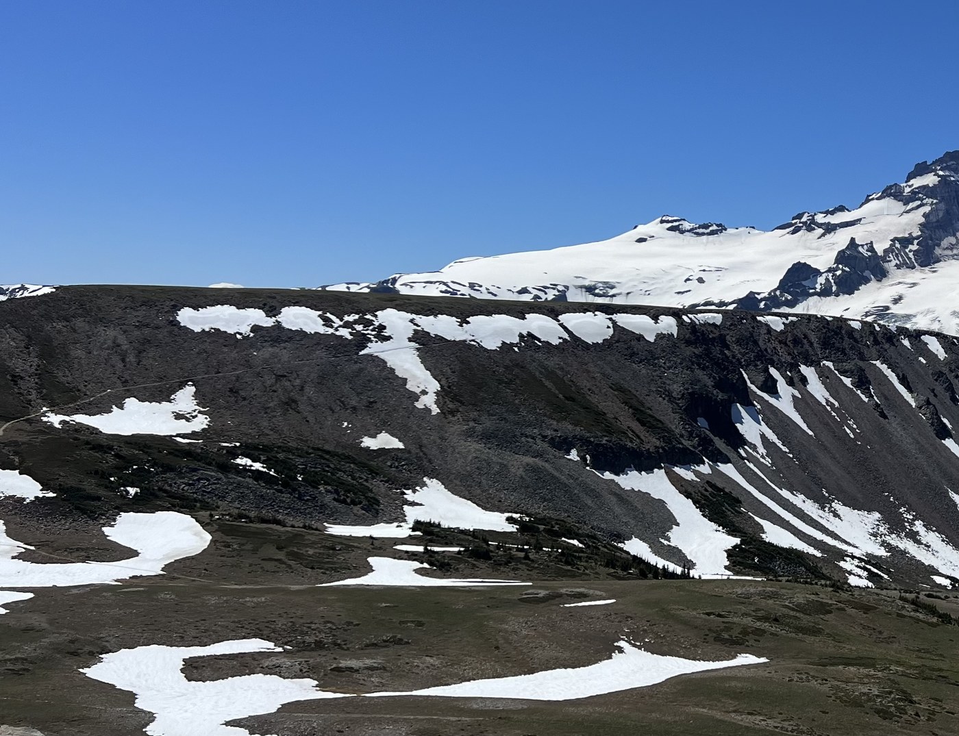 Hiked to the First Burroughs yesterday, but did not go far on it. Still thick patches of snow on parts of the trail. We turned back 1/4 up the trail. Too dangerous for us to continue. Although, others tried climbing on the rocks over the snowed in parts of the trail. I don’t know if they made it. I think in another week maybe it will be doable when more snow melts. We also hiked to Fremont Lookout. Trail is clear of snow. Then hiked down to Shadow Lake. Large patches of snow on the Wonderland Trail going down from Frozen Lake, then dirt trail again to Shadow Lake. A nice hike on a hot day.