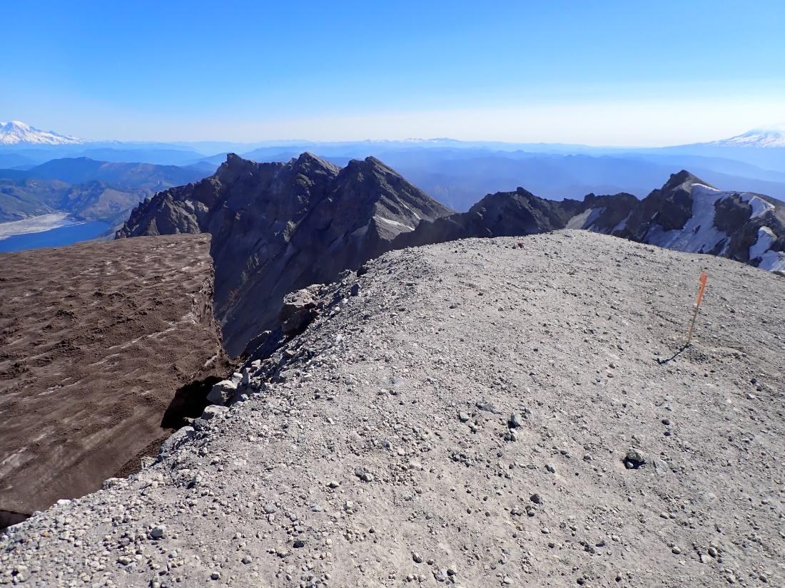 With the ice gone, a 15 foot long by several feet wide section of rim followed the ice into the crater. The rim that remains is 100% vertical, extremely fragile, and continuously undercut by ongoing rock fall. The dangerous section is right at the top of Monitor Ridge where 100% of climbers are arriving on the rim.