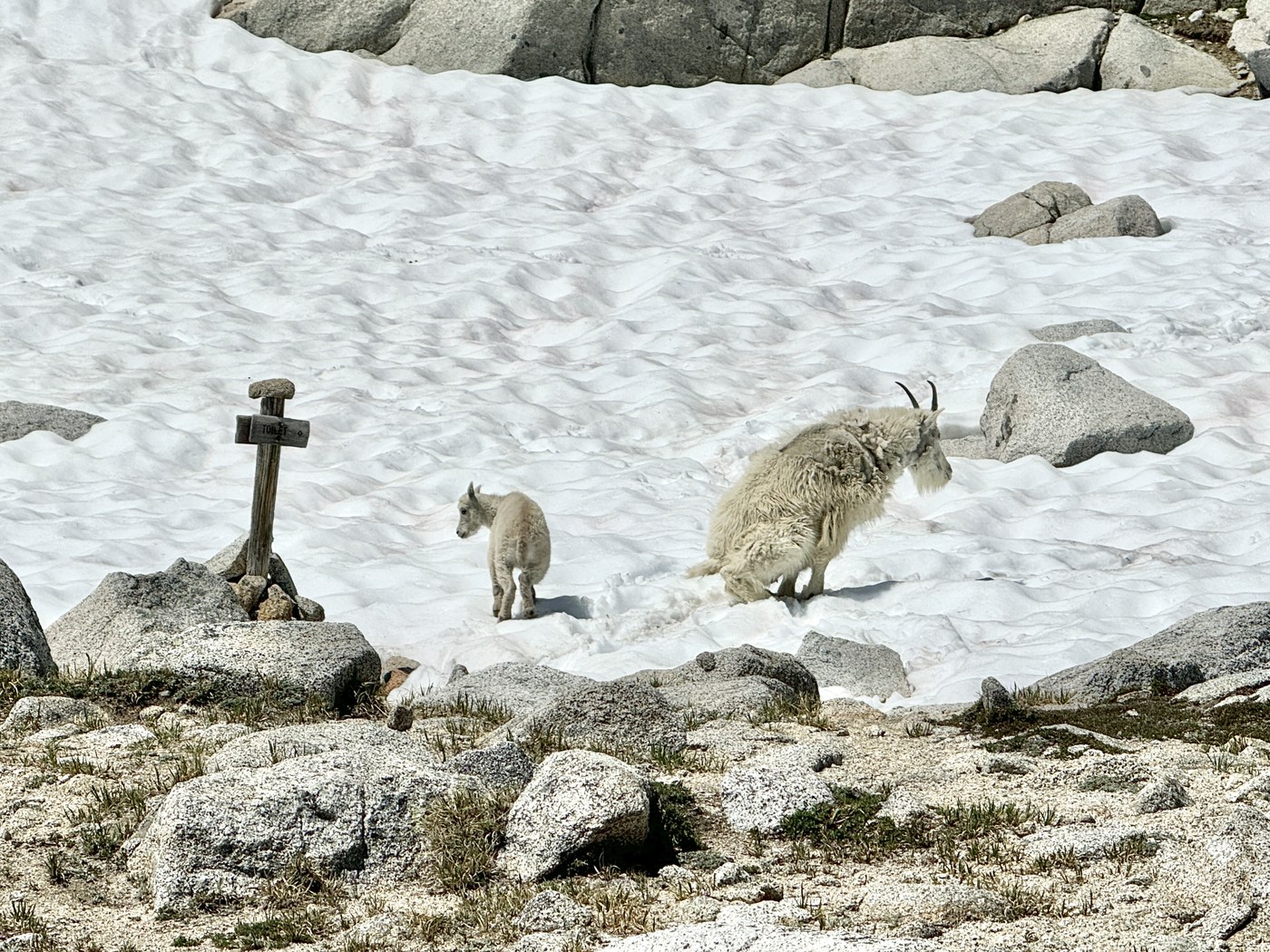 Day 3, 2 of us stayed at the lake, and the other 2 went to Prusik Pass (I had been up there before and didn't want to do any walking, lol. But the route is clear and views are beautiful). Spent a lot of the day sitting on a big rock by the lake reading a book, and only saw about 4 small thru hiker groups come through - there was no one else around (I expected it to be incredibly busy, so this was a nice surprise). There are 4 goats around Sprite Lake, 2 juveniles and 2 adults, all with no concept of personal space and acted more like the family pets than wild animals. There are also great views of Prusik Peak and McClellan Peak with the lake below it from the top of the rocks here.