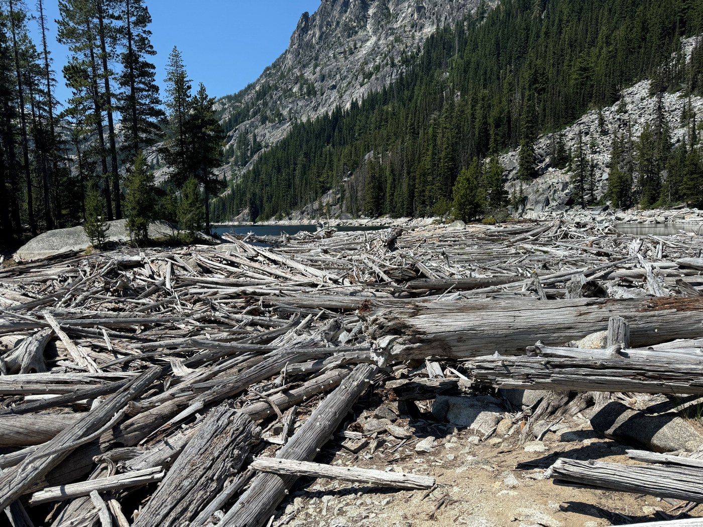 Day 4 we left our camp just before 8am. There is a water crossing at Leprechaun Lake that I don't think is possible to get across with dry feet. We all got wet, and changed our socks when we got to Viviane. After a 10min break there, we headed down, and somehow ended up on the Snow Creek drainage route (which is not the main trail), but it cut off a big section of the slab descent, and made it much faster. Got to the first campsite at Upper Snow Lake at 11:10am, and stopped in the middle of the lake around 11:30a for lunch. Bugs were miserable, so we decided we'd rather just hike out than spend a whole day and night swatting at bugs. The dam is dry and the water level is very low for this time of year (YIKES). I've never done the hike out at this time of year (always later when it's not so hot or the sun is so high), and let me tell you I'd rather go up Aasgard 100x than do this descent in the dead of summer heat ever again. I had 4 liters of water leaving Nada Lake, and was completely out a handful of switchbacks before the end. The "breeze" was like pointing a blow dryer at your face - it was not refreshing. Stopping for a break felt like you were being roasted alive, and it was miserable. Take way more water than you think you need, especially if you're heading up that way - the route up is pretty much exposed all day long.