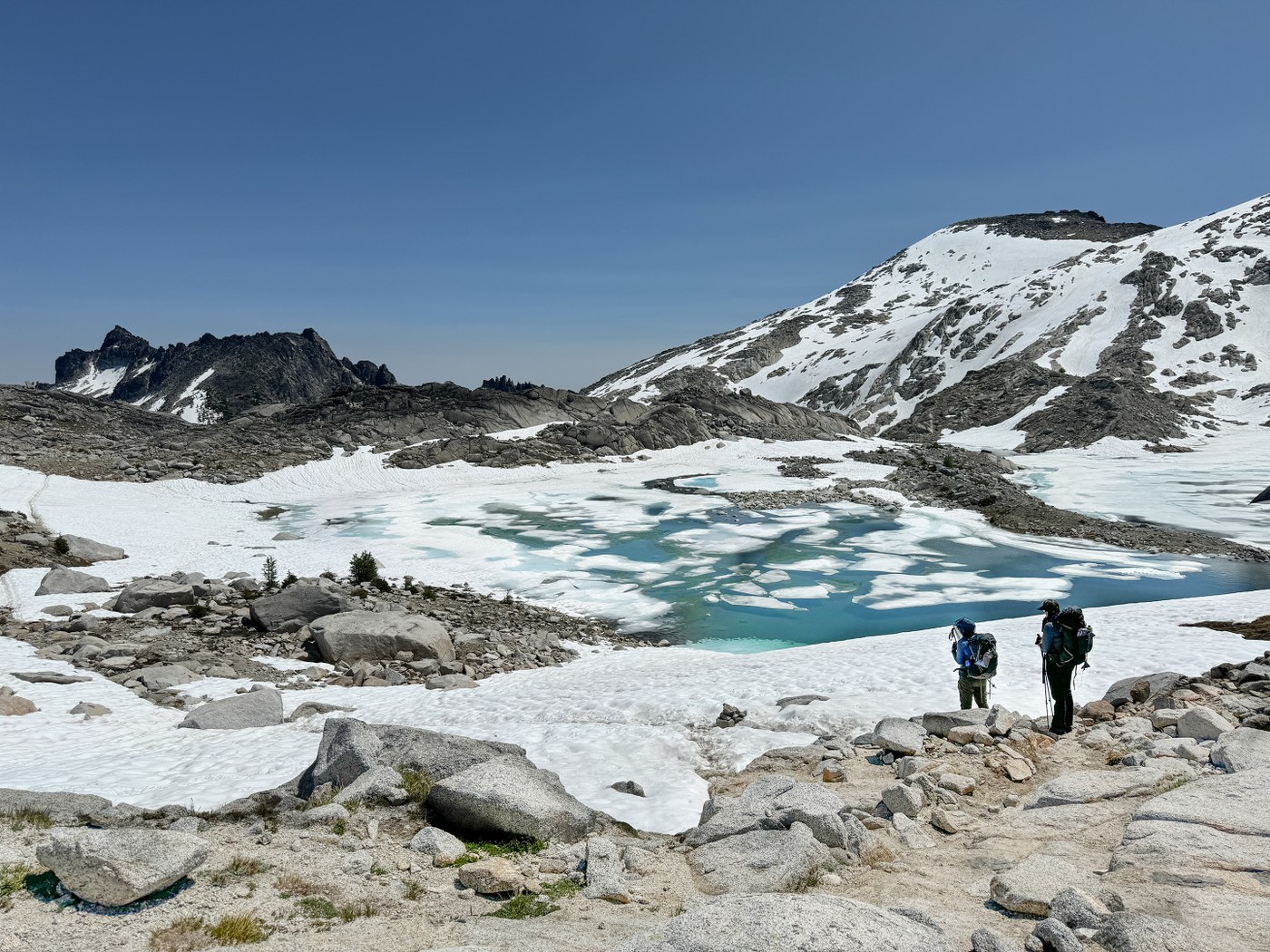 The last snow crossing is the steep section going down to Inspiration Lake. There's a glissade chute that looked sketchy, so we took the plunge step path which was super soft - it'll definitely get worse soon. We camped at Sprite Lake (our intended destination since we had a hammock sleeper and needed the trees). Found our first group of campers there (everyone was gone by the next morning), and we were able to find a spot easily. There are a lot of sites above the toilet if you don't find one closer down, but they have no trees, and are further from the water.