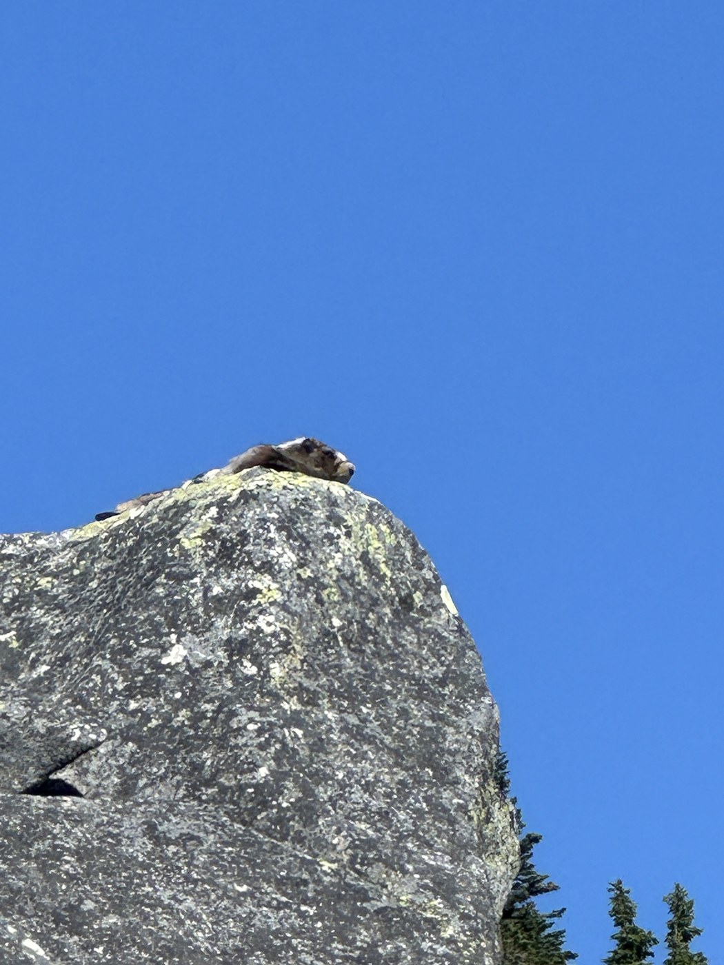 Opted to ascend via the boulder scramble due to previous TR's about snow crossings. This is doable with some exposure, and saw a big marmot sunning on a rock. After chatting with some people at the summit opted for the standard trail, as the snow crossings are very mild and was fine just in hiking boots.