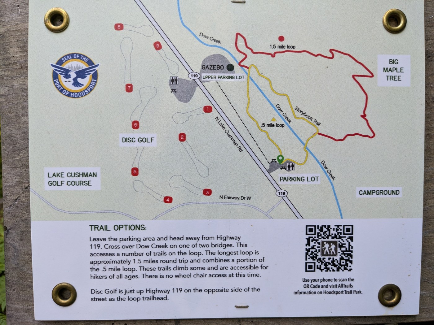 Notably, there are two parking lots. There is the official signed one to the south with a toilet and picnic benches, and then a second "upper lot" a couple hundred yards further North with a random Gazebo. The upper lot is directly across 119 from the Hoodsport disc golf course.