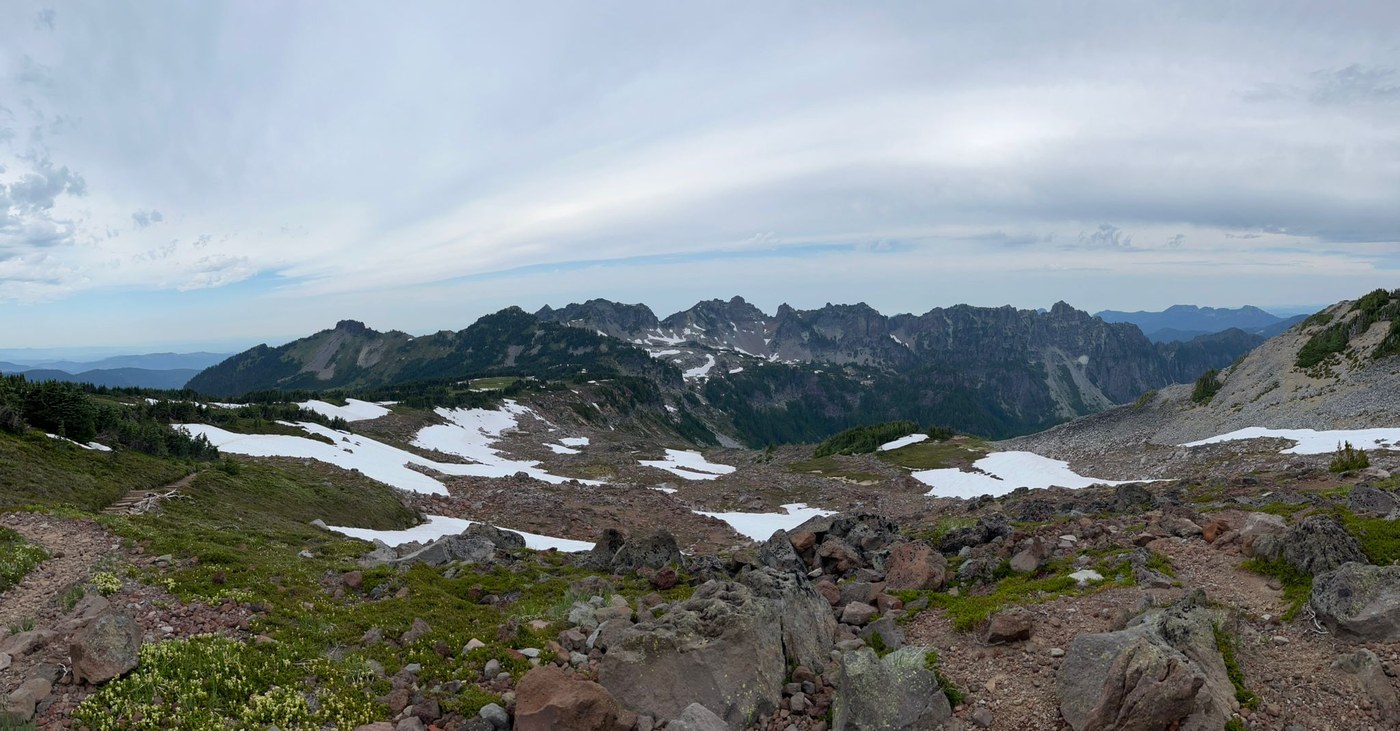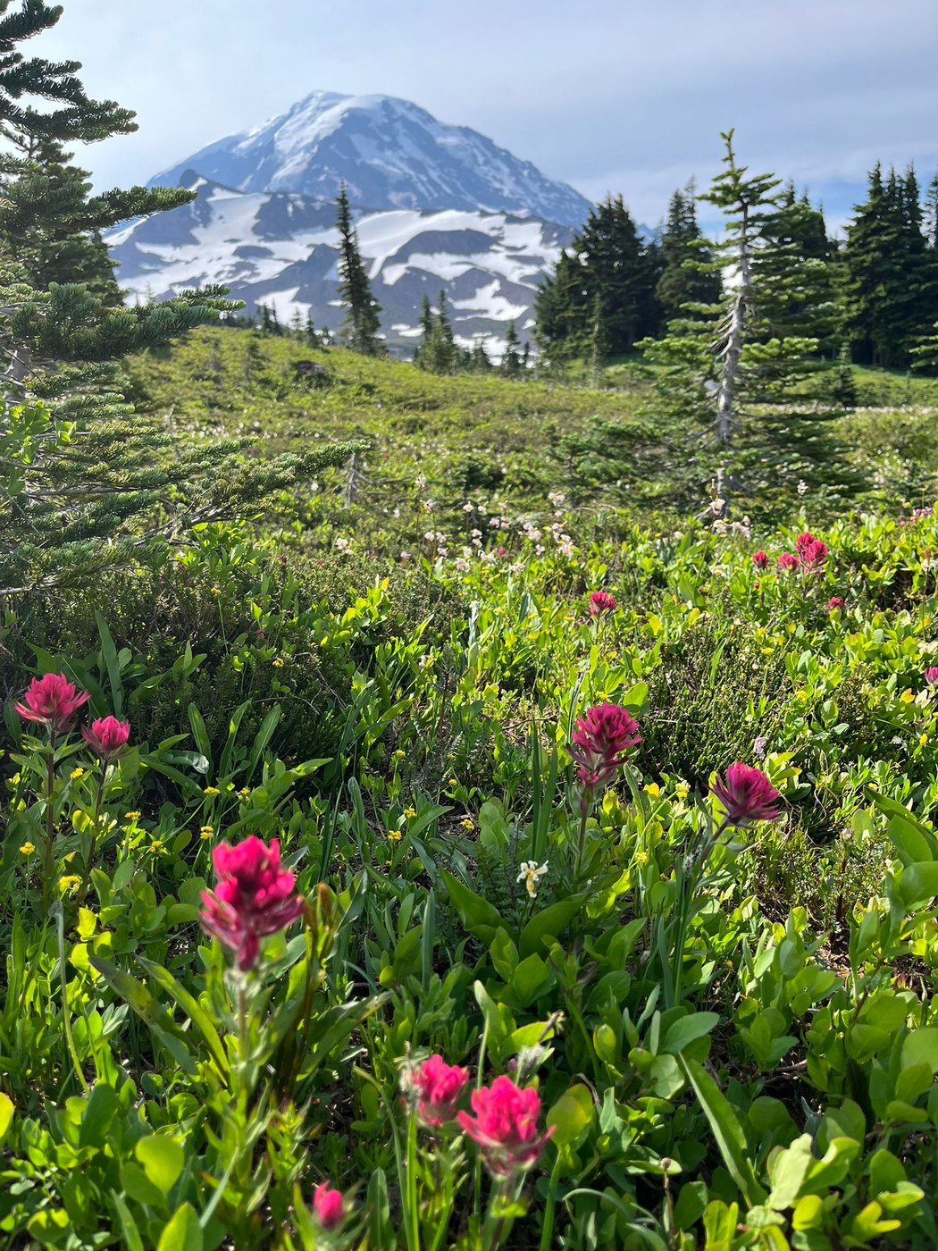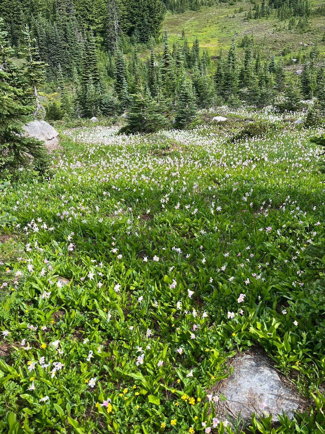 Did a day hike from Mowich Lake up through Spray Park, then down through Seattle Park to Cataract Valley before turning around and returning the way I came. Everything the previous Spray Park trip report (July 13th) was true for this day too - including the wildflower explosion and the bear sightings close to Mowich Lake! The section between Spray Park and Cataract Valley had a few snow fields - I set off at 8am having camped at Mowich Lake the previous night, reached the top before descending around 11:15am, and despite a mix of sun and clouds the snow was already quite soft making crossings a breeze. Mosquitoes were HUNGRY that day starting in Spray Park and going on up - within a minute after each time I stopped it was like a cloud of buzzing descended. Suggest bringing long sleeves/pants just for that purpose alone. And poles for the snowfields will make things easier - I was glad I had mine but they're not absolutely critical if you're just on a day hike. I had the trail mostly to myself (and the mosquitoes and the bears) the whole way up except for maybe 2 other people, and then on the way back down met a few groups but not too many. The road up to Mowich only opened on July 12th, and the conditions were the best I've seen compared to previous years. Thanks to the crews who keep these trails reachable!