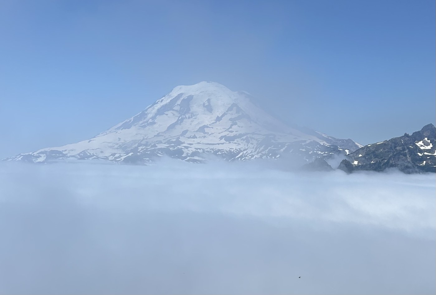 The trailhead is off of hwy 123 just outside MRNP so no timed entry pass needed. The trail starts uphill immediately and continues up for 3400 feet over 9 miles. It ended up being a cloudy/foggy day but cleared enough for us to sneak in some spectacular views of Rainier and the Tatoosh range. Ideally, wait for a clear fall day when the fall colors are reported to be amazing. We are 60 something and 70 something 😆 and it took 6 hours to complete.