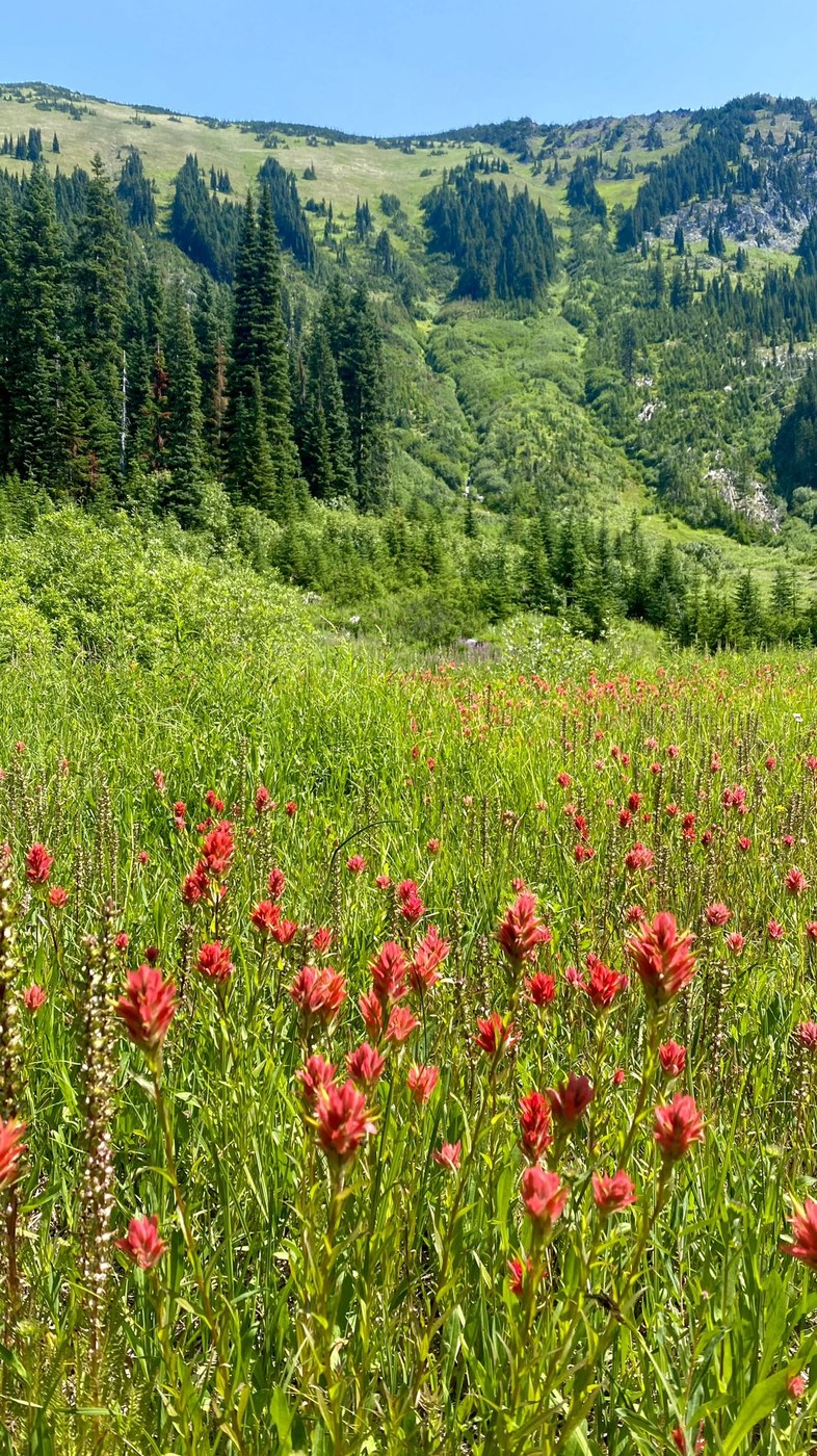 The trail itself is in great shape. Starts with a gentle slope going through a really beautiful forest, but the halfway point you come into this basin with tons of wildflowers before starting the steeper section in the woods, which eventually gives way to open grass and Meadows. The meadow here is steep, but switchback to make it manageable and very beautiful. Probably my favorite part of the hike, especially on a nice and cool sunny day. But a hot day you may be getting scorched by the sun.