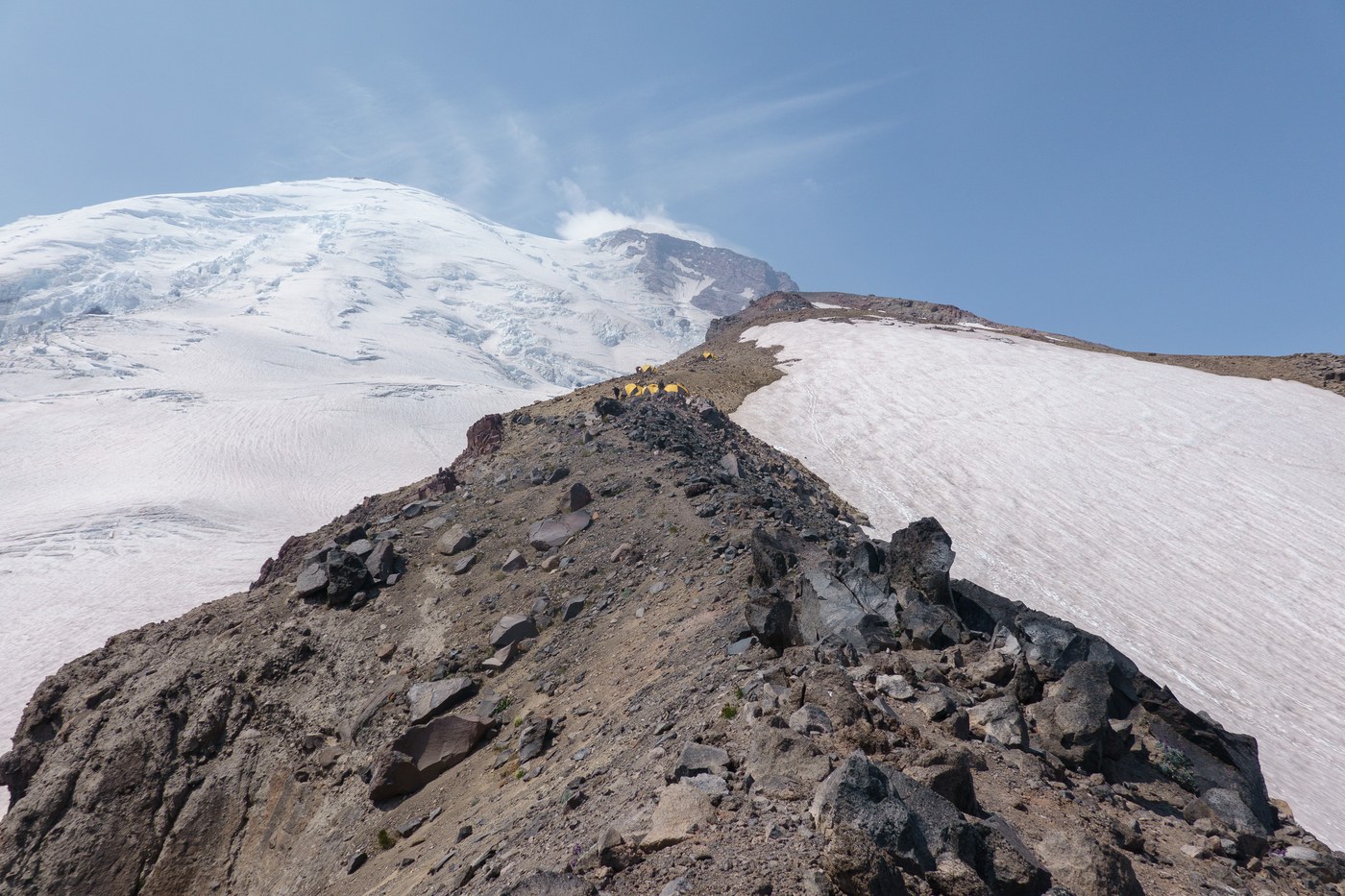 Crowds. No queue when I reached the Sunrise entrance station one minute to seven. But all trailhead parking lots I passed were already full, including the one at White River Campground. Camps all looked busy. Didn't encounter anyone after crossing the White River until Camp Curtis. Slow trickle of parties heading up or down the Inter Glacier.