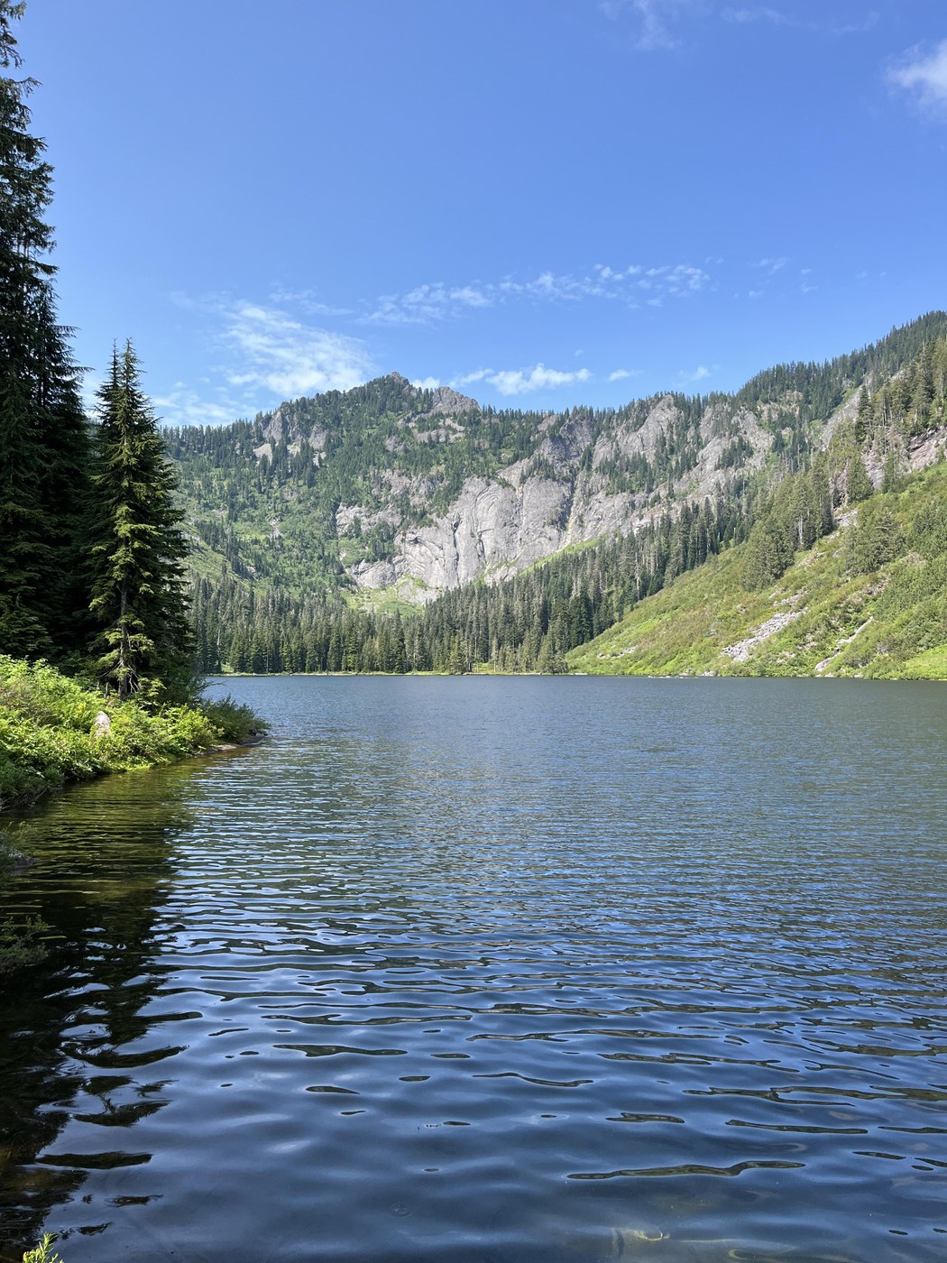 Not much new to add to the previous trip reports about Marten Lake Trail. There is no sign for where to turn off of the Snoqualmie Lake trail so a GPS could be useful. Since it has been dry the Marten Lake trail is mud free, maybe a few steps in softer dirt, but the roots aren't slippery. The trail was nice and soft and we were under tree cover for the majority of the time which made for pleasant hiking. There are some orange and pink flags tied to tree branches marking the trail and with a few glances at GaiaGPS we found the lake easily. The salmon berries were sweet and the blueberries were getting there.