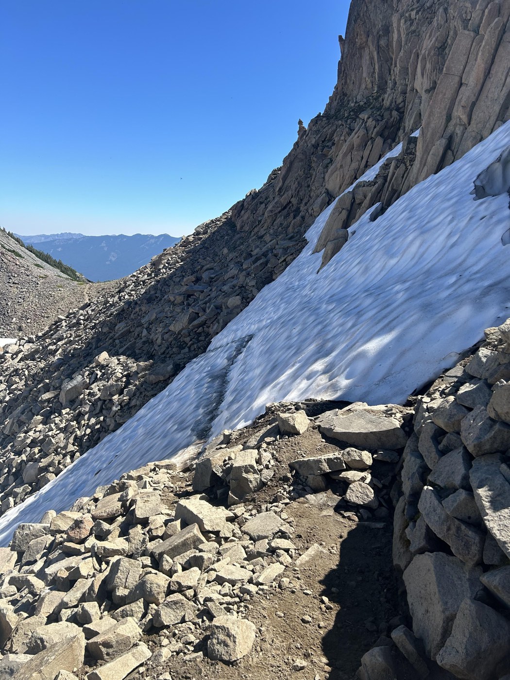 Trail is easy the whole way. the last snow field is not safe to traverse imo. we scrambled below in the talus both directions and it's very easy.