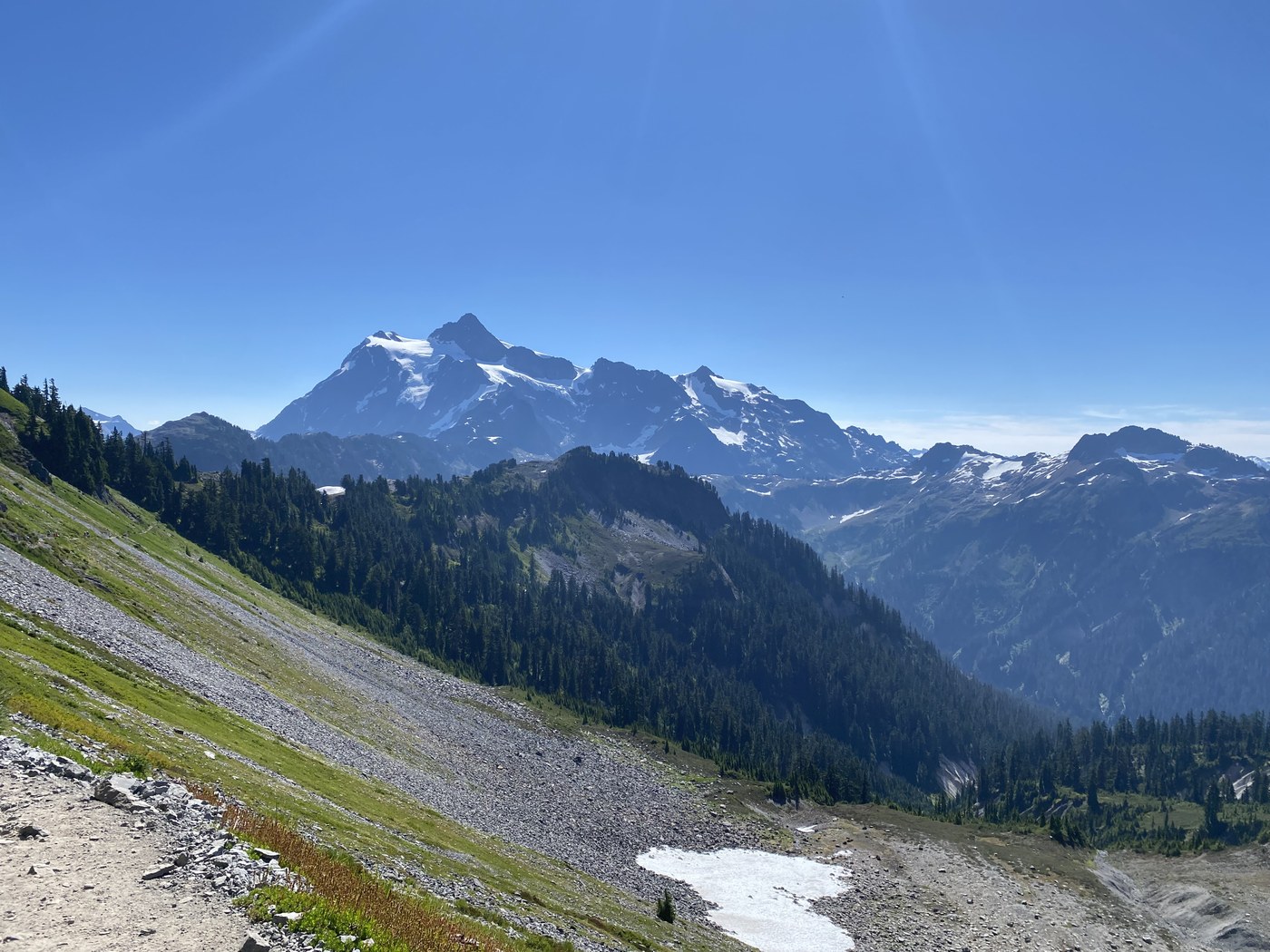 Going counterclockwise makes uphill sections steeper but shorter in contrast to a long and slow descent (parking by Terminal Lake avoids the climb back up to the Artist Point lot). Moderate/hard is an apt rating for this hike. The trail is incredibly well maintained so the steep sections are very manageable. Sun exposure and dehydration are what can tip this hike into the hard zone. This hike is mostly exposed which brings gorgeous views but also comes with being in the sun all day. Starting early (we did not and the two pm sun was hot hot hot) and bringing lots of water and sunscreen a must.