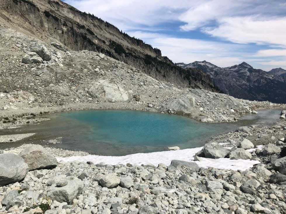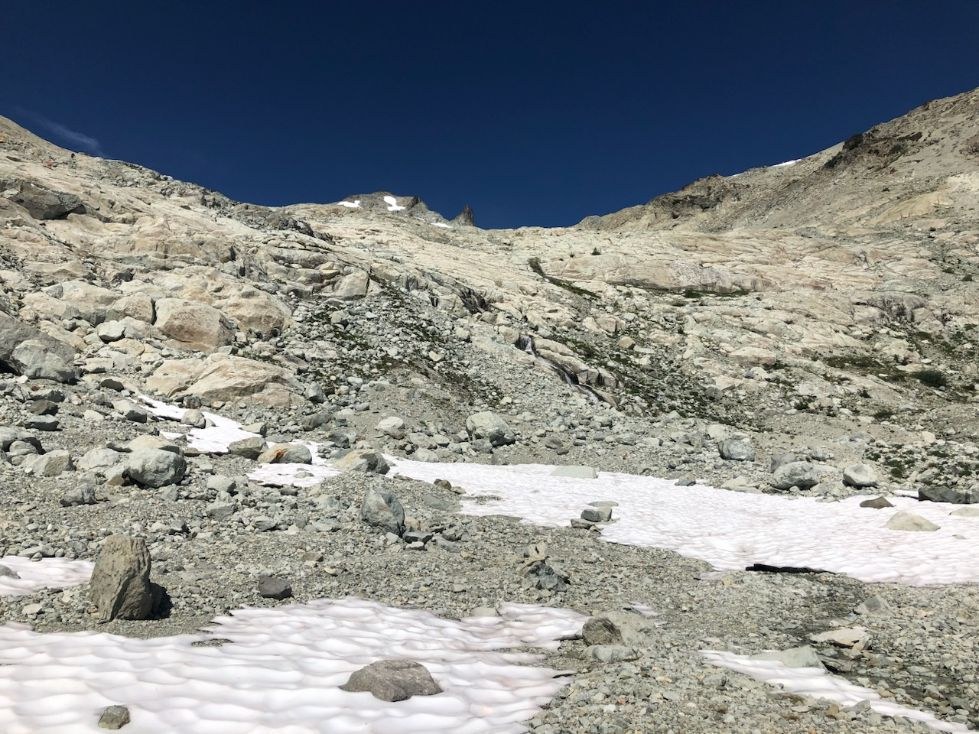 18th annual summer backpack trip with friends. Three of us hiked to Cathedral Rock and Pass, camped at Peggy's Pond, and did a day hike to the inter-glacial moraine area of Mt Daniel. Aug 2-4. Very hot days! Baking on the first day, cloudy morning and slightly cooler day on Sat, and hot day on Sunday. Bugs were level 4/5 except when we hiked up to the base of Mt Daniel. Started at 10:30 am on Friday, up through the switchbacks of the forest, rested at Nosh Nosh Wahtum lake, then along the ridge to Cathedral Pass and the junction with the PCT. Then the very exposed and full attention .7 boot path on the mountainside and into the Peggy's Pond basin. Arrived at Peggy's--only one other party there. Made camp right by where the trail meets the lake, not realizing it would become a major thoroughfare for people heading back and forth to Mount Daniel. Much busier camp than I was expecting. Had no idea this many people climb Mount Daniel! Beautiful lake beneath the massive Cathedral Rock. Had a great swim in the lake, a wonderful evening, and lots of stars. Headed up to the rock and glacier base of Daniel the next day and spent most of the day getting up to and exploring and resting in that bug-free area. Took a quick dip in one of the icy pools. Very stunning landscape. Another great evening in camp, talking with quite a few people as they walked through our camp. Got up early the last morning to try to beat some of the heat. Took the "upper way" (instead of "lower") down to the boot trail which made the going a bit easier to start, but still requires much focus on handholds and footwork. A hot trek out, stopped again at Nosh Nosh, and arrived back at car at 12:00 pm. Diners: Red Bird Cafe in Roslyn, Cottage Cafe in Cle Elum; Miles: 13; Wildlife: Marmots, Columbia Ground Squirrels, Chipmunks.
