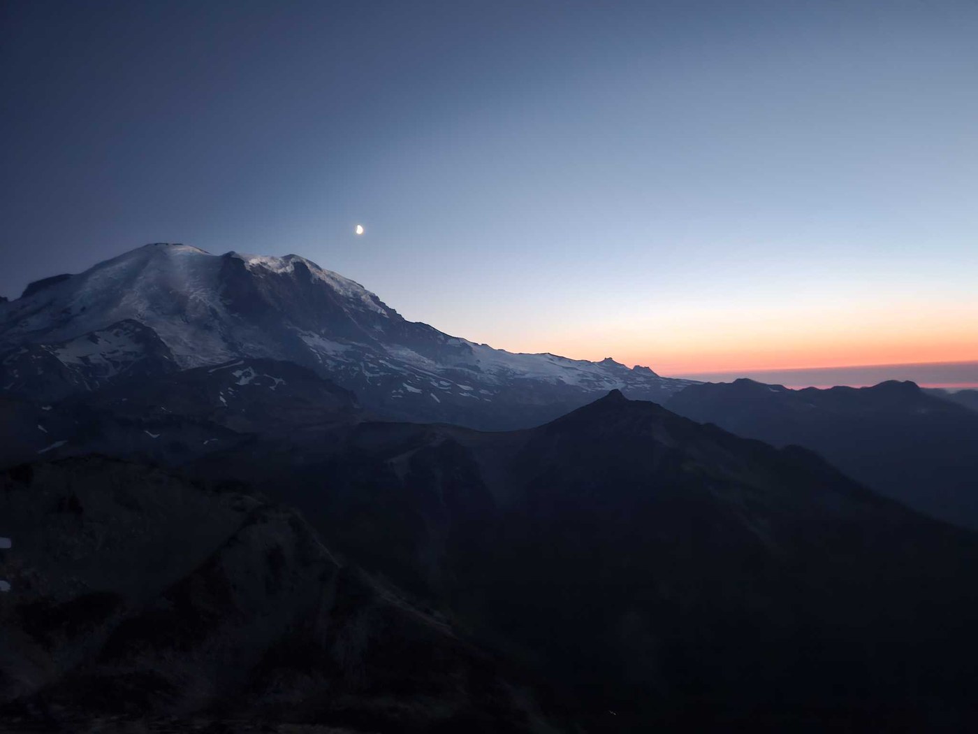 Arrived at the Sunrise parking lot at 1910, and there were still plenty of spots available. Began hike to see sunset at the lookout. Trail was in great shape. Traffic was mainly hikers and photographers setting up for viewing the meteor showers. Arrived at the lookout with about 10 minutes to spare. Enjoyed a beautiful sunset and got to see all of Mt Rainer without any clouds. Spotted the herd of Mountain goats to the East of the tower.