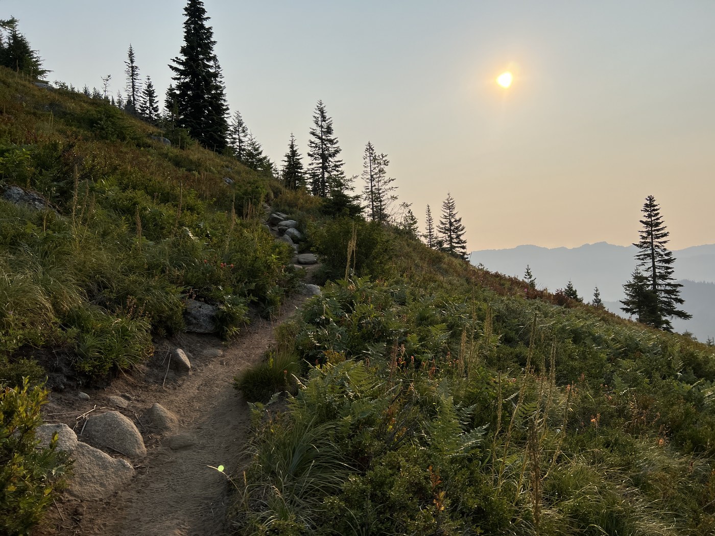Arrived around 6am, parking lot half full, and there were a handful of groups already heading up the trail. Fortunately, they all went to Pratt Lake and we were the first folks up to the top. Garmin had total distance at 8.5mi, elevation 3665ft, total time 6:18, moving time 4:06 (50min of "official" breaks, so I guess those momentary stops really add up!). When we got back to trailhead, lot was full, cars parked all along the access road and some folks were parked on the I90 ramp too.