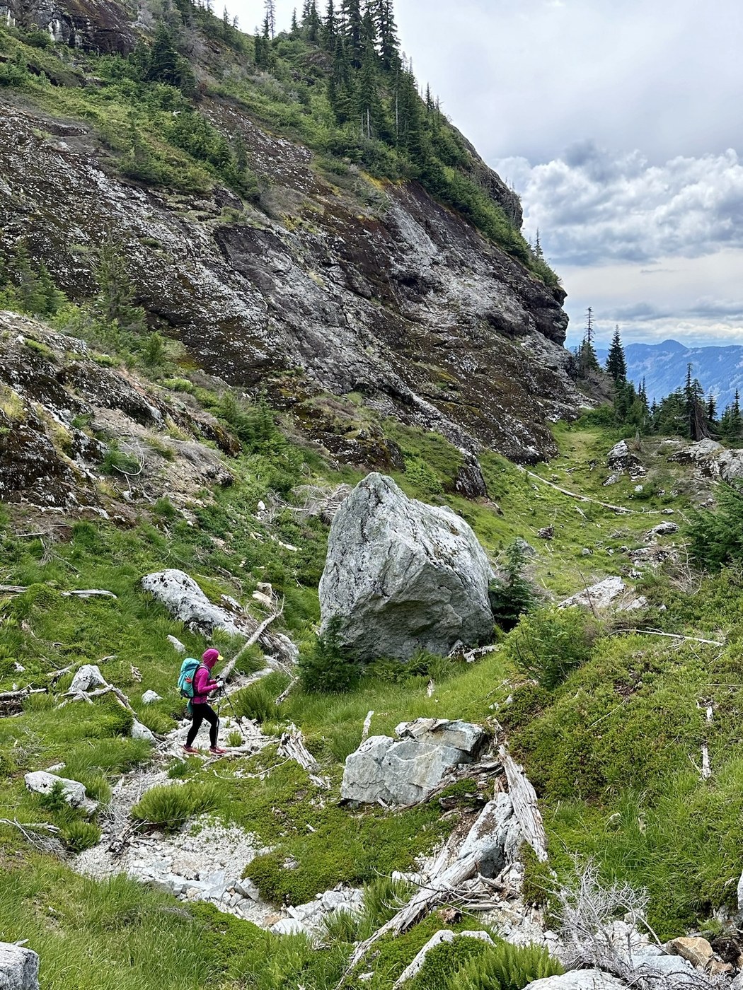 We took the Commonwealth Basin approach from the PCT trailhead, heading out around 7 AM. The trail was actually fairly enjoyable, as it winds through a few distinct different landscapes: started flat along the creek, climbed through forests dotted with cool rocky outcroppings, crossed boulder fields, entered a beautiful exposed meadow, a little bushwhacking in overgrown sections, and finally an awesome view of the exposed scramble to the summit.