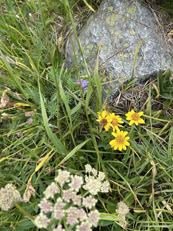 Our group of four scored an early entry ticket into the Sunrise Corridor and then easily found a campsite at White River. Spirits were high! After setting up camp we headed out on the Glacier Basin trail. The entire trail is in beautiful shape, although dusty from the dry summer days. The asters, arnica and paintbrush added color to all the green! It took us just a few hours to reach the wilderness camp of 6 sites and walk beyond it to enjoy lunch with views of the Inter Glacier and meadow below Burroughs. The wilderness toilet is quite a walk from the trail but has amazing views!