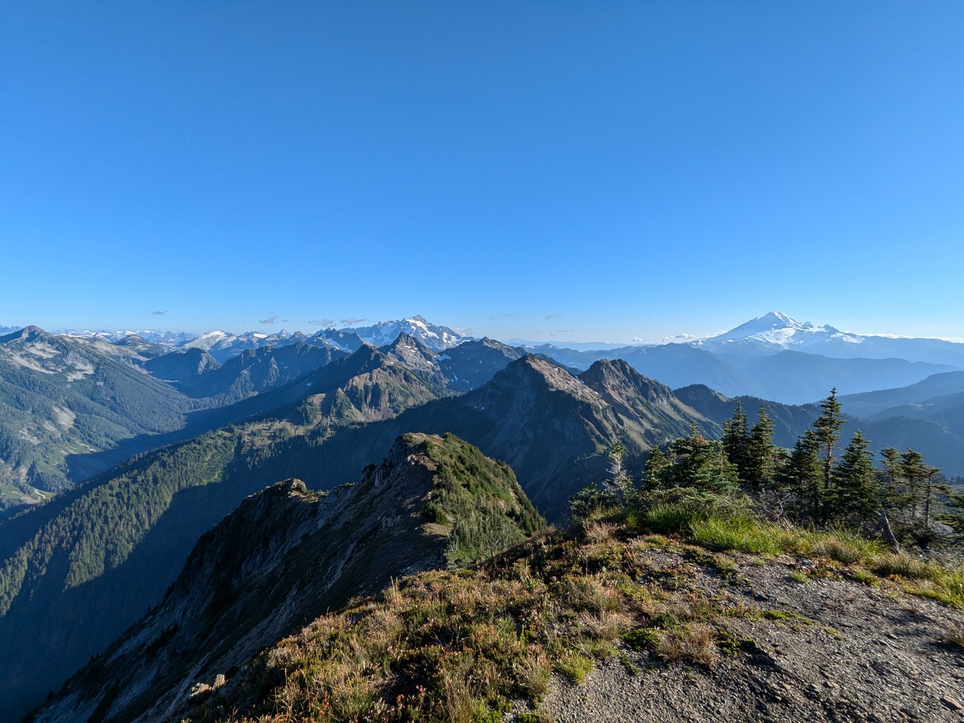 My daughter and I hiked to the Winchester Lookout and it was great. Views were awesome, tons of blueberries, the lookout is really cool, and there is a resident chipmunk who is well fed. We returned to the junction with High Pass and had clocked 3.45 miles. Decided to do High Pass. If you are going to drive THAT road up and you are an avid hiker up for the day, Winchester may not be enough. High Pass is much less used, is slightly overgrown in places, and has wildflowers blooming. There are a few trickling water sources if you need them. Just before each pass, you get a punchy, switchbacking climb, but each gives you a new view. When we reached High Pass, we checked the map and my 18 year-old said we really needed to finish the trail. Our years of encouraging (forcing) our kid to do hard things may have paid off. It is ~.7 and the steepest section. Our achilles burned and the trail is faint at times, but the views from the top top High Pass. On the way in, ran into a younger couple who had summited Larrabee and one other young guy. On the way out in the afternoon, we saw no one except a small family of Sooty Grouse.