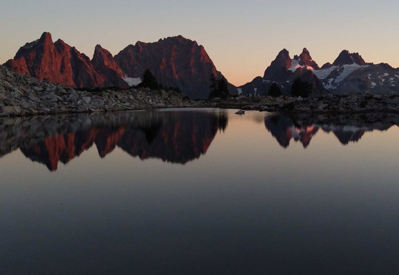 After climbing another steep rocky section, you approach pretty Jade Lake. I passed Jade, crossing the inlet via rock hopping and continued up to Emerald and Opal, passing a boatload of blueberry and huckleberries. I was originally planning on camping south of Opal Lake at a site I used the last time I was here, but it has since overgrown, so I decided to just head up to Tank Lakes. I am sure glad I did. I scored a beautiful site on the north side of the lake with an awesome reflective view of the Summit Chief Mtn. and Overcoat Peak in the lake. The only downside is that the sun “sets” behind the ridge so it cools off early compared to sites west and south of the lake. But the view is worth it. The moonless night provided endless stargazing and a lovely view of the Milky Way reflected in the lake. I ended up just staying at that site for two nights. There were about 8 folks camped there at 5 sites my first night.