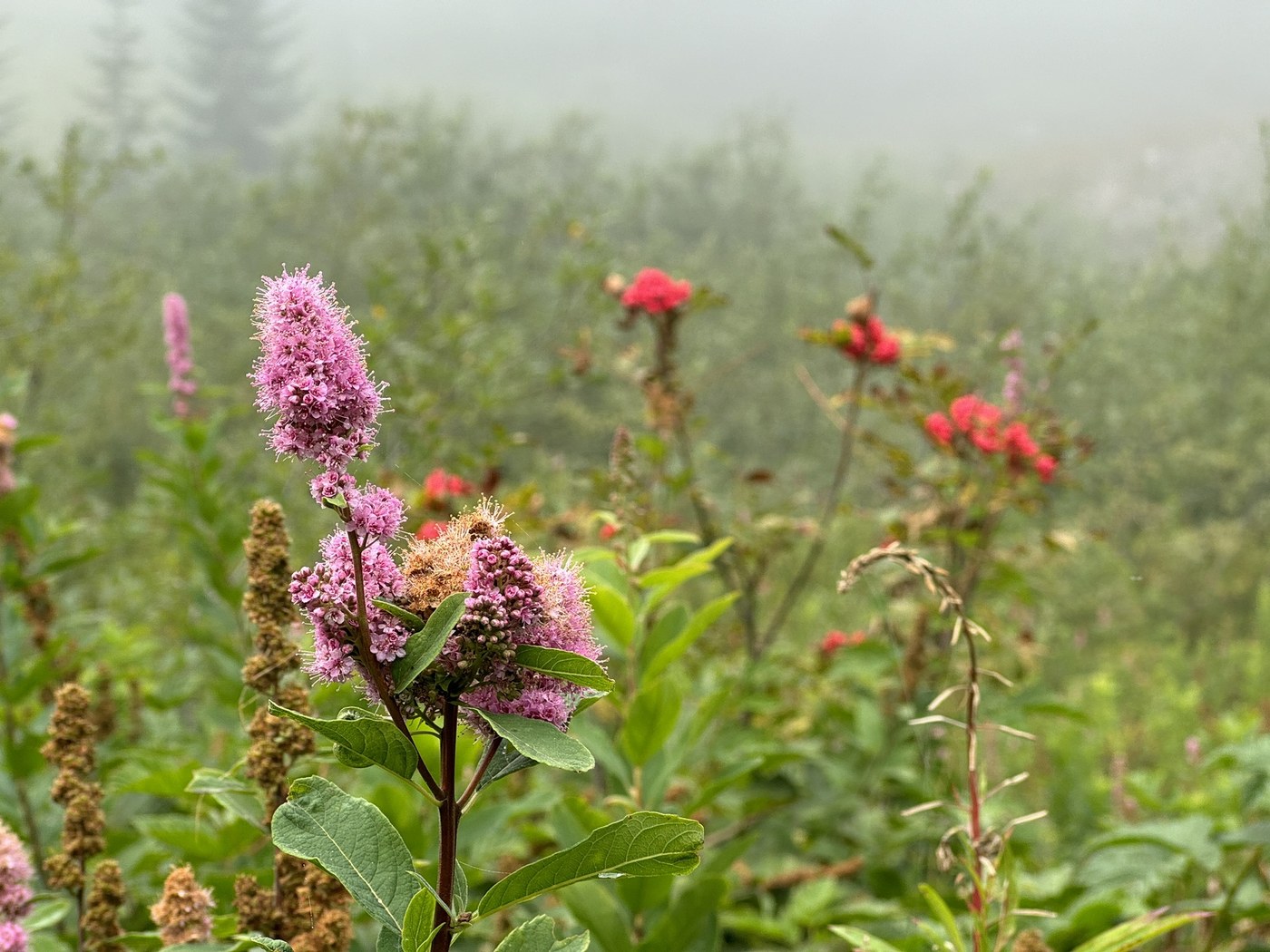 Trail was in excellent condition all the way to the lake and then it was quite muddy along the shoreline of the lake. No bugs today. Just beautiful foggy views.