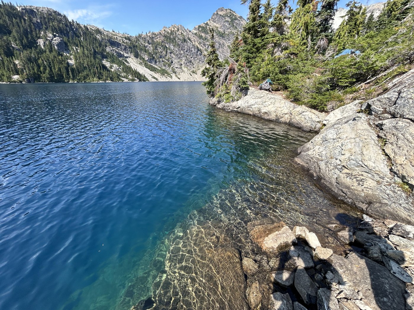 We hiked from Salmon La Sac trailhead to Waptus Lake on day 1. The trail was very nice and easy, pleasant hiking. The ford was straightforward; I wore my trail runners to protect my sensitive feet and did not regret it. Waptus Lake was hopping, but thankfully there are a plethora of campsites, so we had no trouble finding a spot by the southeast side of the lake. Pit toilet was nice too.