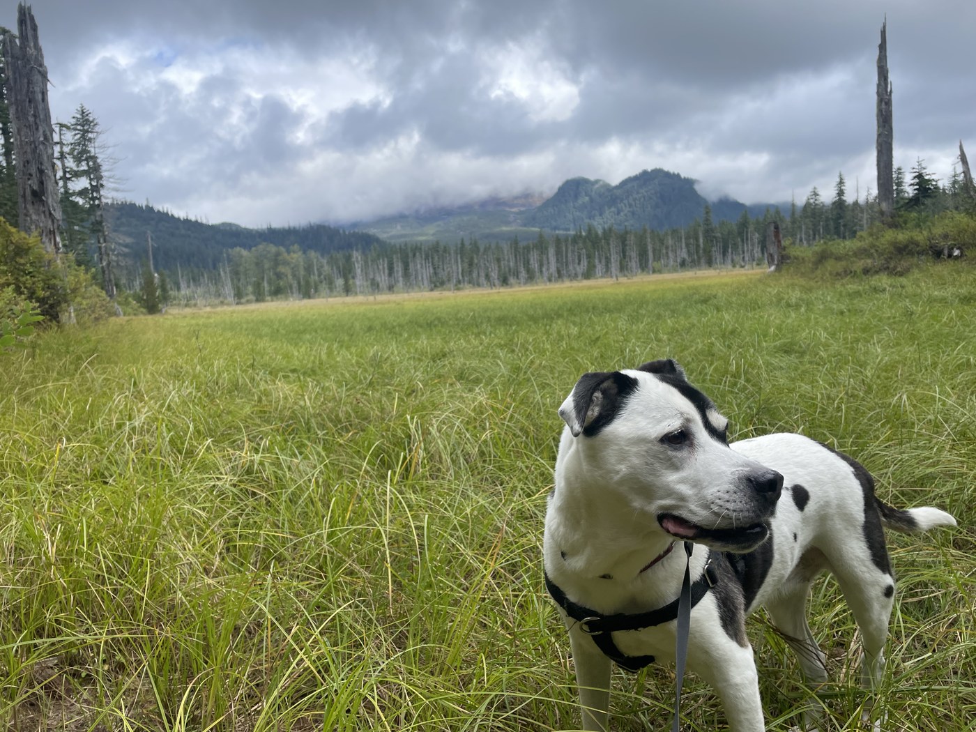 At this time of year, there were no lakes. Just puddles. And the clouds hid most of Mt St Helen’s. It was still a worthwhile hike though! I only saw 4 other people in trail. No other dogs.