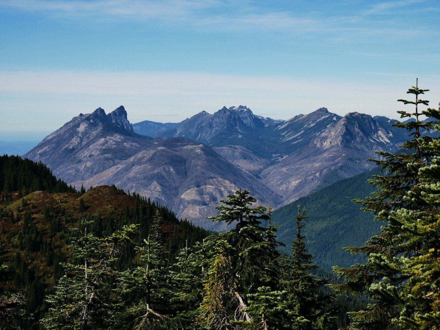 Views from the summit were great. The primary view is to the south with Mt Daniel to the left, Hinman to it's right, and then Overcoat, Chimney Rock and Summit Chief in the distance to the south. There was even a peak of the top of Mt Rainier a bit more to the right. We ate lunch and wandered around a bit to find viewpoints in other directions. Nice views were to the west, including Mt Baring, Gunn Peak and Merchant Peak, and to the north where Glacier Peak dominated, but also Sloan Peak and the Monte Cristo group were visible.