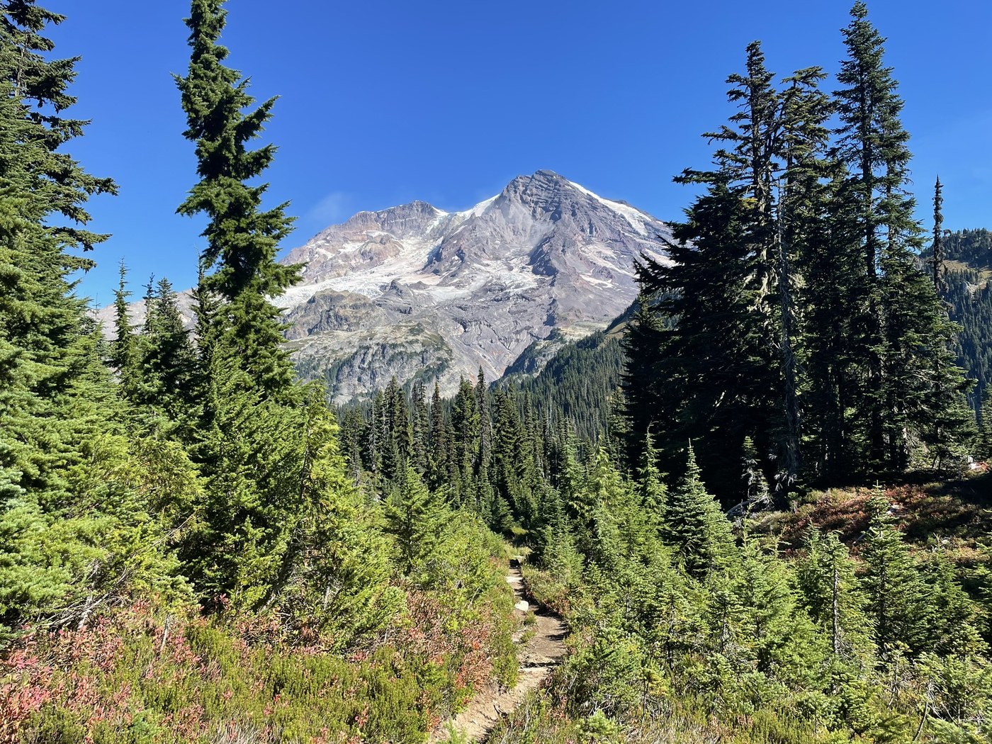 Took advantage of what might be the last warm day of the season by hiking the Kautz Creek trail to the fantastic meadows at Indian Henry's. As always, this is a lung-burning climb. The total vertical was 3,600 feet, with most of that coming on about three miles of trail. The payoff makes it worthwhile. The views of Tahoma are what I consider the most spectacular in the park. The trail is in great shape (other than being so steep). There is one trickle of water at the 3-mile mark, but other than that it is dry. Carry all the water you are going to need. Had a nice lunch on the porch of the patrol cabin with a backcountry ranger and a Wonderland Trail through hiker. Saw a total of six hikers all day. For this trail that's a crowd.