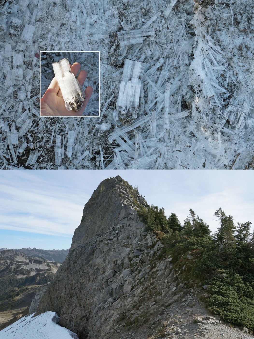 Due to the annual route 542 tree trimming, the road was closed many miles below the trailhead starting around 7am so I passed through before that in time to get to a nice sunrise watching spot near the Ptarmigan/Chain lake Loop junction. (The 7am-4pm highway closures are scheduled to continue through Thursday). The trail had stretches of pretty frost heave (see pics), not too bad frost covered rocks, not too bad glazed ice and some pretty nasty black ice covered rocks. Luckily, the black ice was mainly only in the descent below the lake loop junction. All this led to some muddy stretches on the return. For my 23rd Ptarmigan journey, I chose the Coleman Pinnacle scramble addition. I had not been up there for more than nine years. The usual scramble heads up the pinnacle’s west ridge after gaining its base west of Coleman on scree. The route up the pinnacle is on very solid rock, though with places of high exposure and one short bush whack through tiny trees. There was a slight dusting of snow on the pinnacles summit. Mount Baker’s dusting of snow was beautiful as were the fall colors. The road closure until 4pm left the trail nearly deserted. I only passed one couple and family of three during the last 3.5 miles back to the trailhead. From the top of the pinnacle, I saw about two dozen other early birders headed to Goat Lake or farther west.
