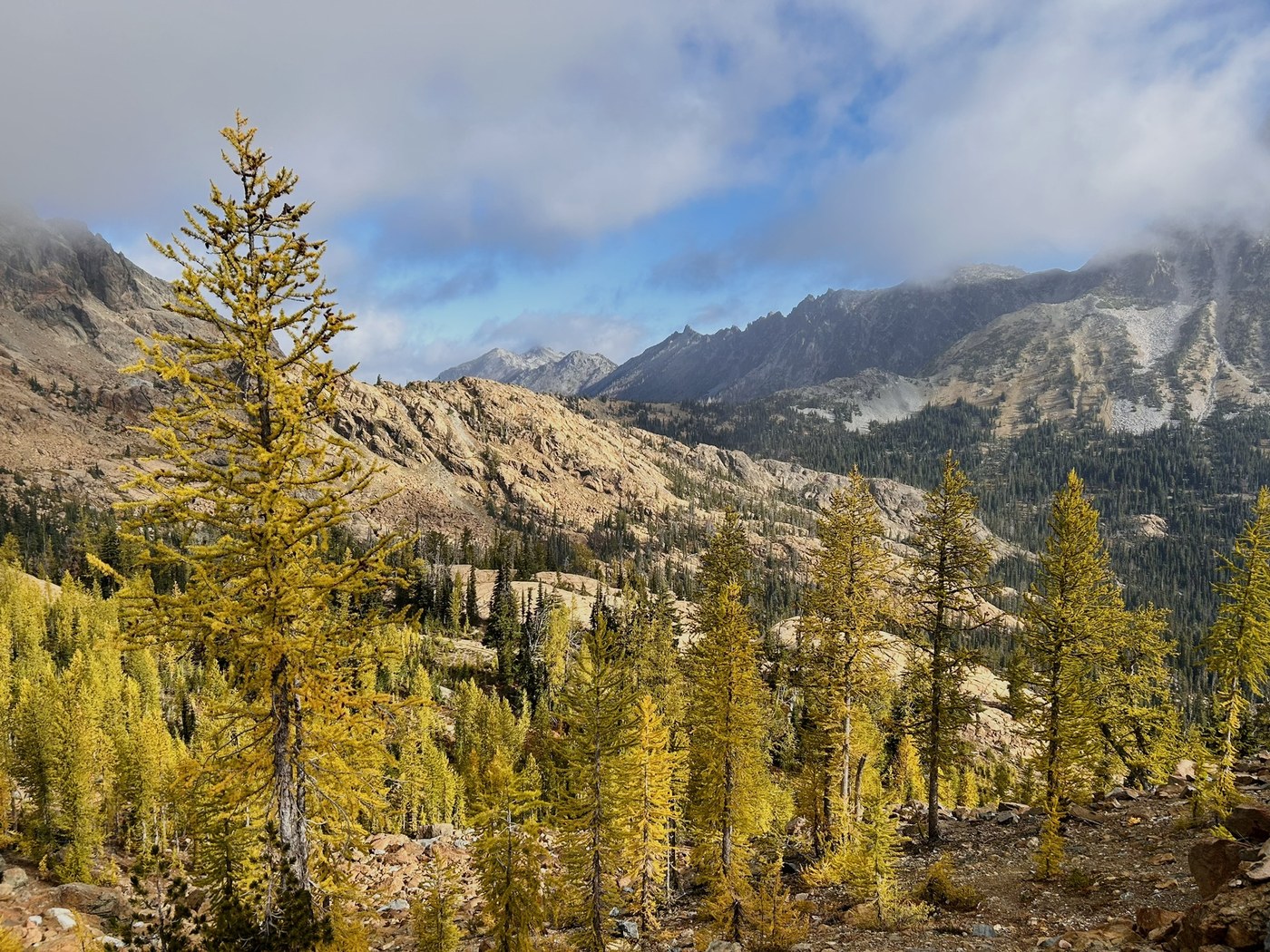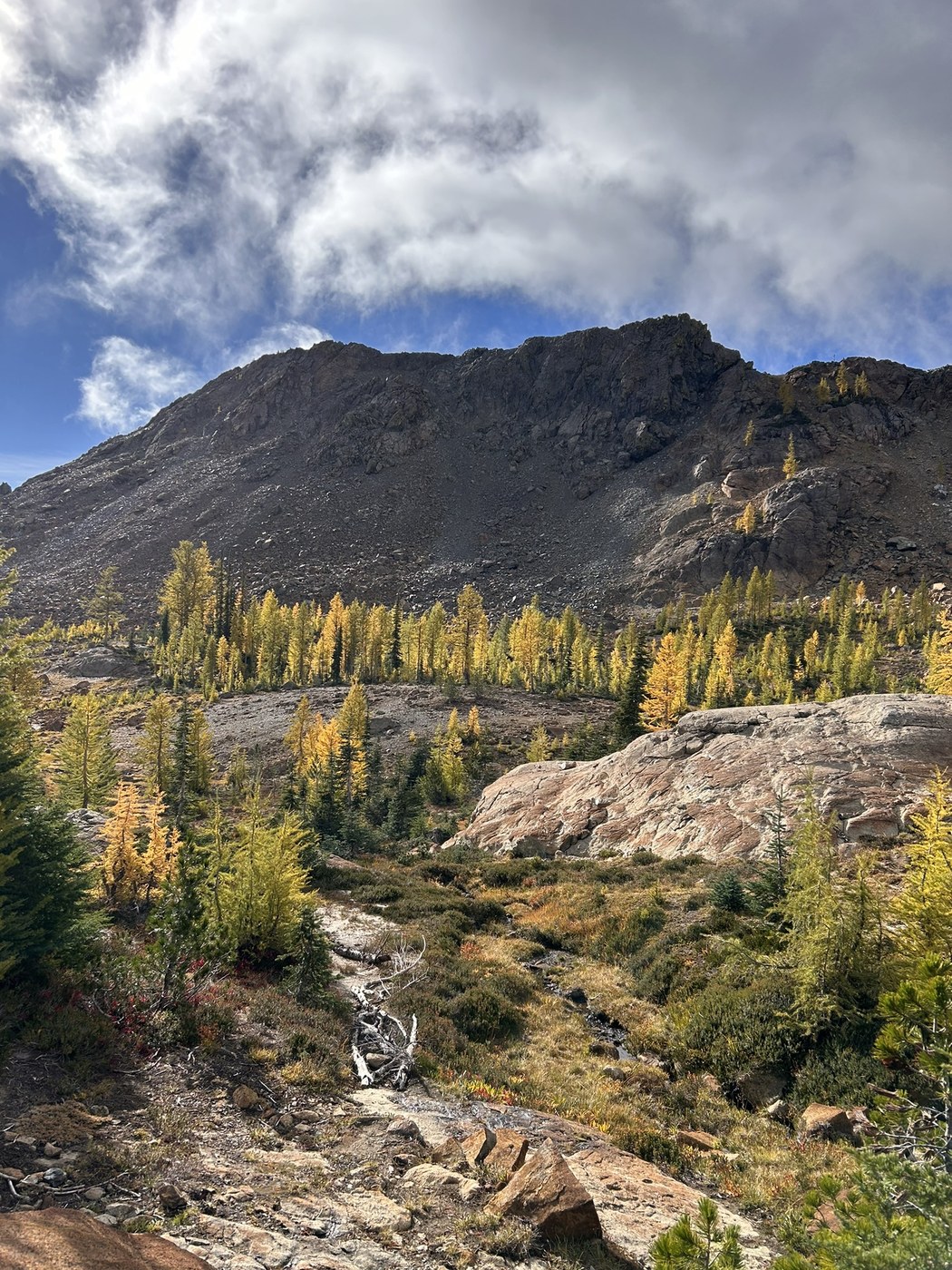 We arrived at the trailhead at 7:30 and there were 4 other cars. It was very windy and a few brief flurries Larches were starting to turn and will likely be in peak color in a few days. The last half of the trail can be a bit challenging between way finding and some scrambling. Follow the cairns!