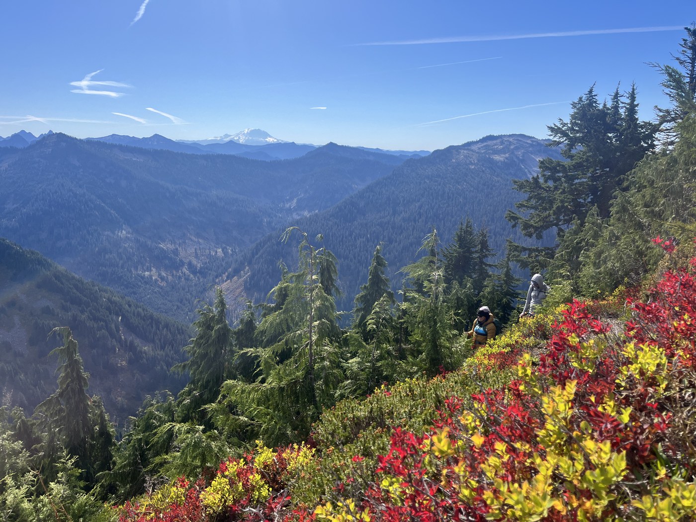 No one else on the trail on this weekday, clear views of Rainier and Seattle, and autumn colors in the sun - can't ask for more.