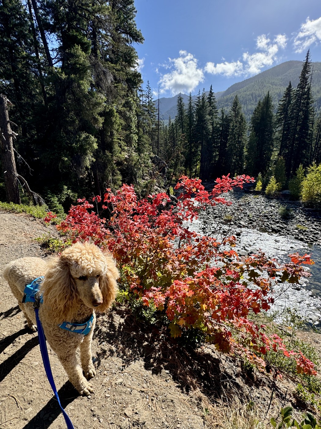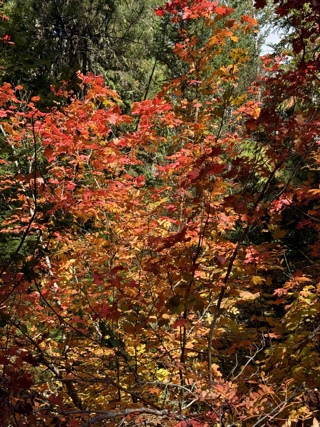 This is a beautiful and easy hike where there were a number of people, children, and dogs on the trail. The vine maples were in lovely color and Icicle Creek and the surrounding hills are gorgeous. It was good to be among the orange-barked Ponderosa Pines, something I don’t have around home. There were mushrooms in the forest after recent rains and I did see a few larches, but none of them in great display or in full golden splendor yet.