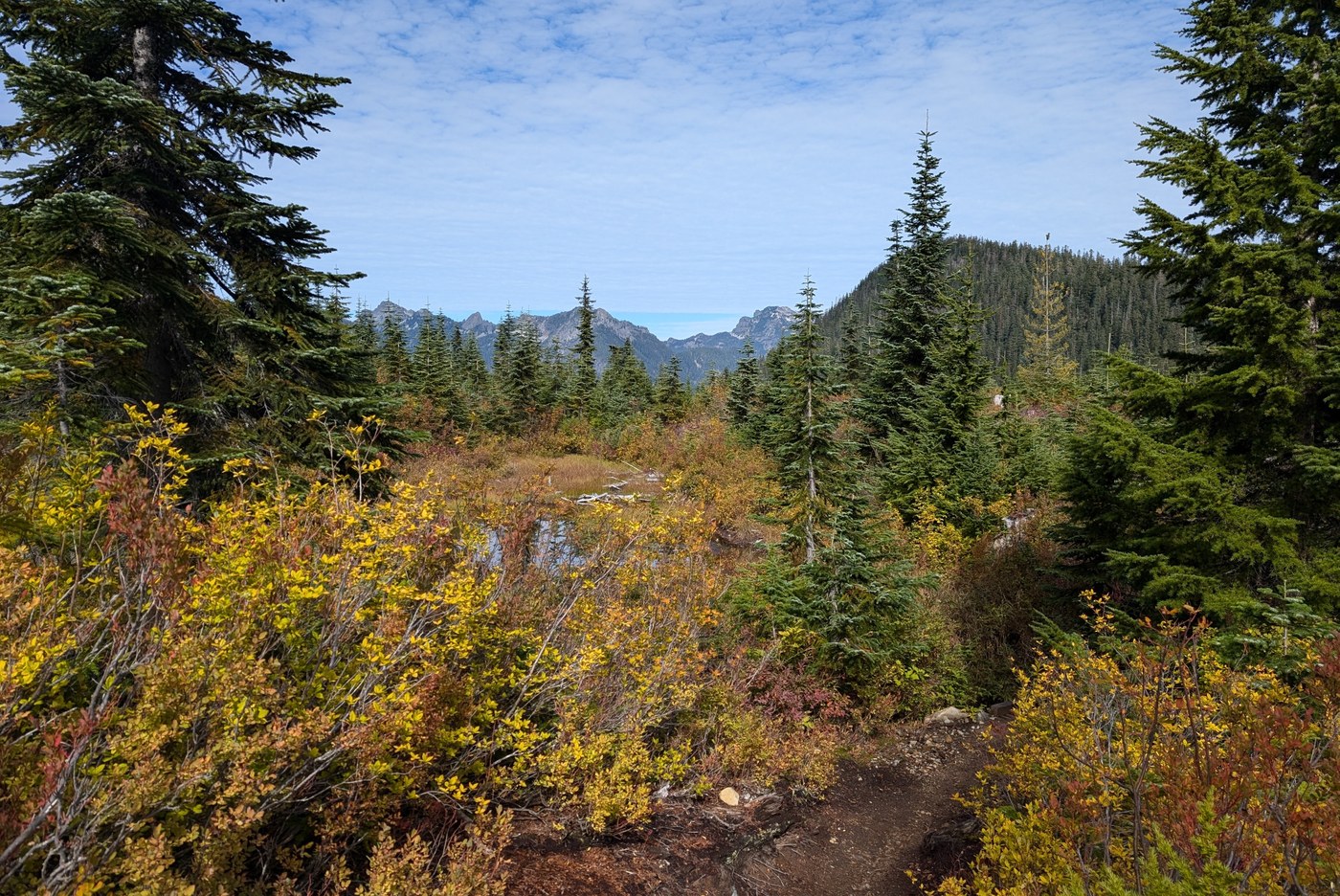 Right when you turn onto the Silver Peak trail there was a right and left option. I would go left because right takes you into a talus area where the trail isn't as obvious. The trail stays pretty easy to follow but there are a few side trails, splits, and ambiguous sections so a map would be a good idea. There was a bit of sloshing around in the mud (not deep) and rocky areas, with one scramble that was easy but did require my hands. My dog managed it alright. The views and colors in this area are great and just keep getting better.