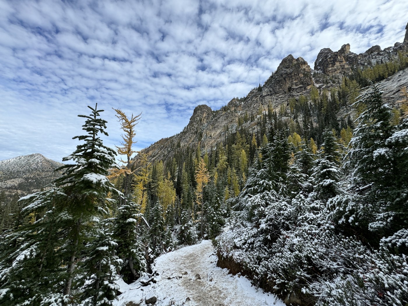 The larches looked pretty peak to me - there are a few that are still a little green but overall they were beautiful. I think there should be at least another good week for larches. At the open area about a mile in when I looked up I thought there were going to still be more green but when I got there most of them were bright yellow.