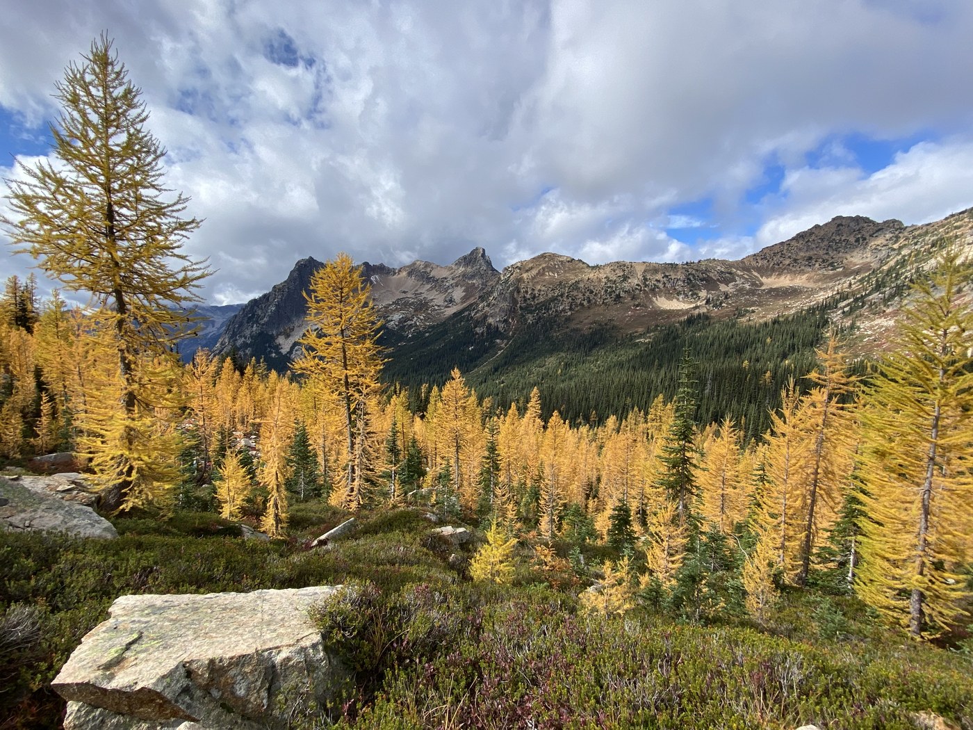 Trail: in great condition with just a few areas of mud due to water draining. Very gradual trail all the way up to the pass thus the longer distance. Saw first Larches at 2.5mi on the hillside across the valley and incentive to push further. At 3.0mi you start entering Larches surrounding you. The last 2 mi is the most continuous amount of Larches I have seen. Doesn’t disappoint.