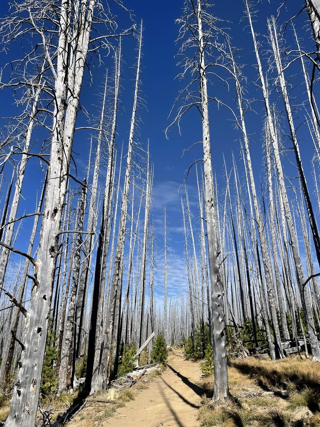 The first mile offers a few places to get off track. Park. Start on the jeep trail, go roughly a third of a mile. You’ll see a sign for Lillian loop. Veer right. Very shortly after that is a second junction, veer left. (I believe a prior trail report describes veering right at both junctions, this definitely would get you…not doing this hike.) Then you’ll continue through the dead forest as described. At about 0.9 miles from the parking lot, you arrive to the ridge as described. Right before cresting, there is the option to turn left. Don’t (unless you’d like to circle back to the parking lot on Lillian loop.) Instead take the straight ish path that heads over the crest (and then down to the left). Great views and rolling hills await.