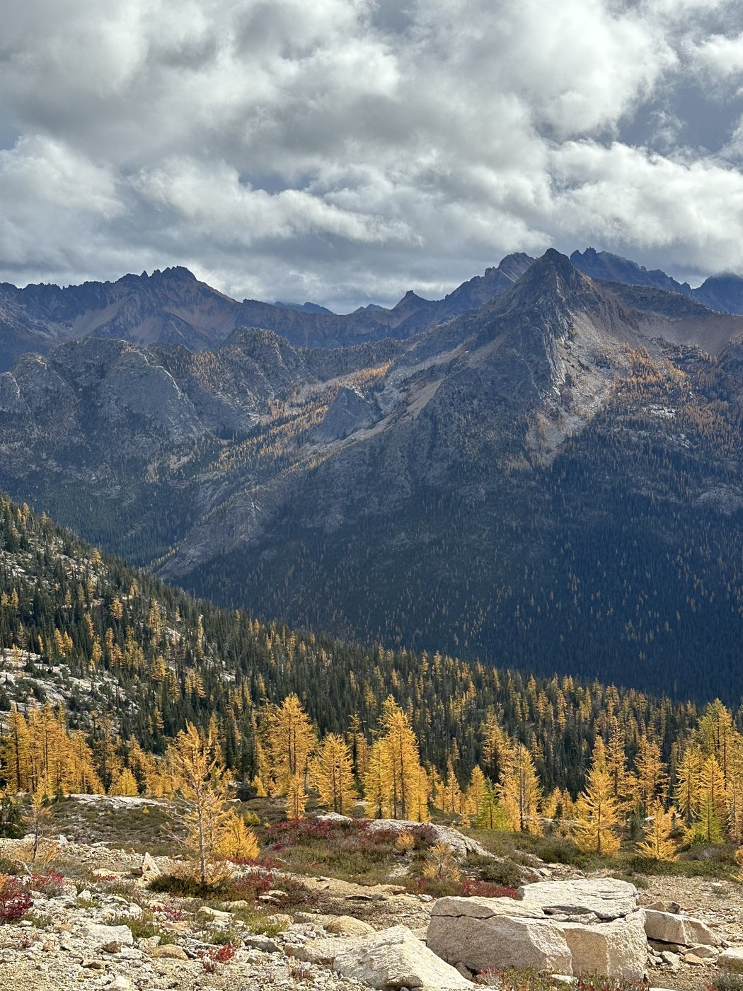 The weather forecast must of deterred hikers today. There were plenty of parking spots when I arrived at 7:00; when I left, with parking limitations, it made getting out on the deeply rutted road easier. On the trail there is only a couple of short sections of slick mud from the recent rain/snow. Creek crossings were a breeze compared to years past. Drizzly at first, once entering the larches, unique views opened up which made for a great hike! Larches appear to be mostly at peak, there are still some turning color. Trail had light traffic today and included 6 PCT thru hikers on their final days! All on the trail were friendly. Enjoy this fall hike while you can.