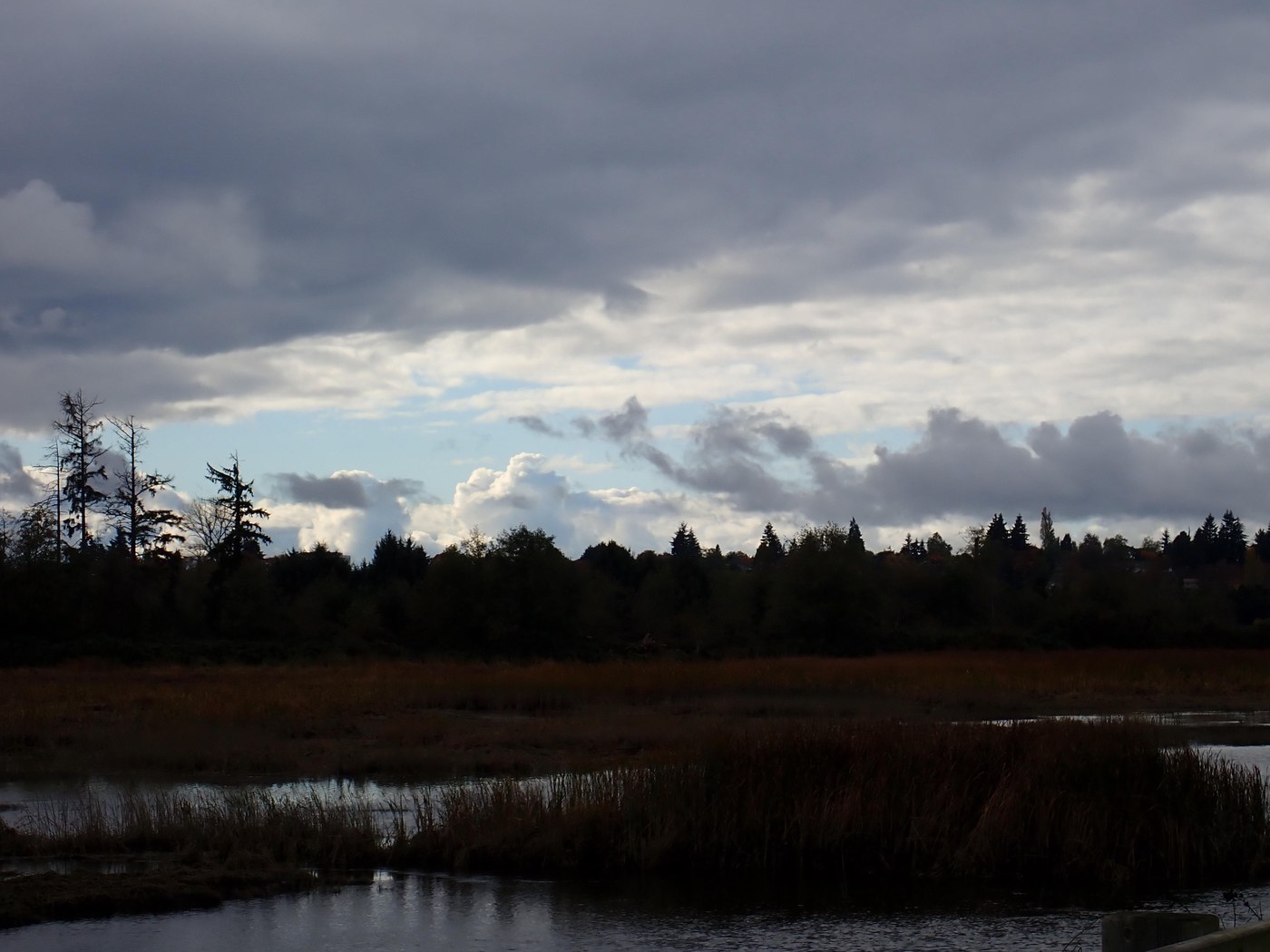 Just a heads up, roadwork is being done on one of the bridges and there is a detour to the other bridge. When getting there from Marine View Drive you have to go down Broadway until you find a place to turn around and head back north. My advice would be to exit earlier off 5 and go up Broadway. Watch for the exit to the park off the bridge, it's open and coned. If you want directions just plug in Everett Animal Shelter, sewage treatment plant or Langus Park. We parked at the furthermost parking spot, walked up to the trail start under the freeway so we could make a loop. The trail is all paved until you get to the footbridge. We took the trail cutting straight across the estuary, as others have mentioned the trails going around are so overgrown as to be uneven and hard to navigate thru. Not too many birds today, some ducks, and some geese flying toward the Skagit. Stop at Langus Park and use the restroom there.
