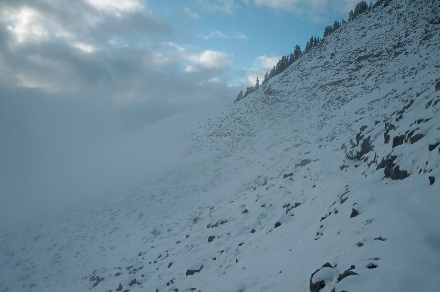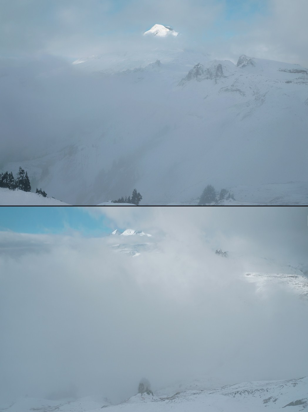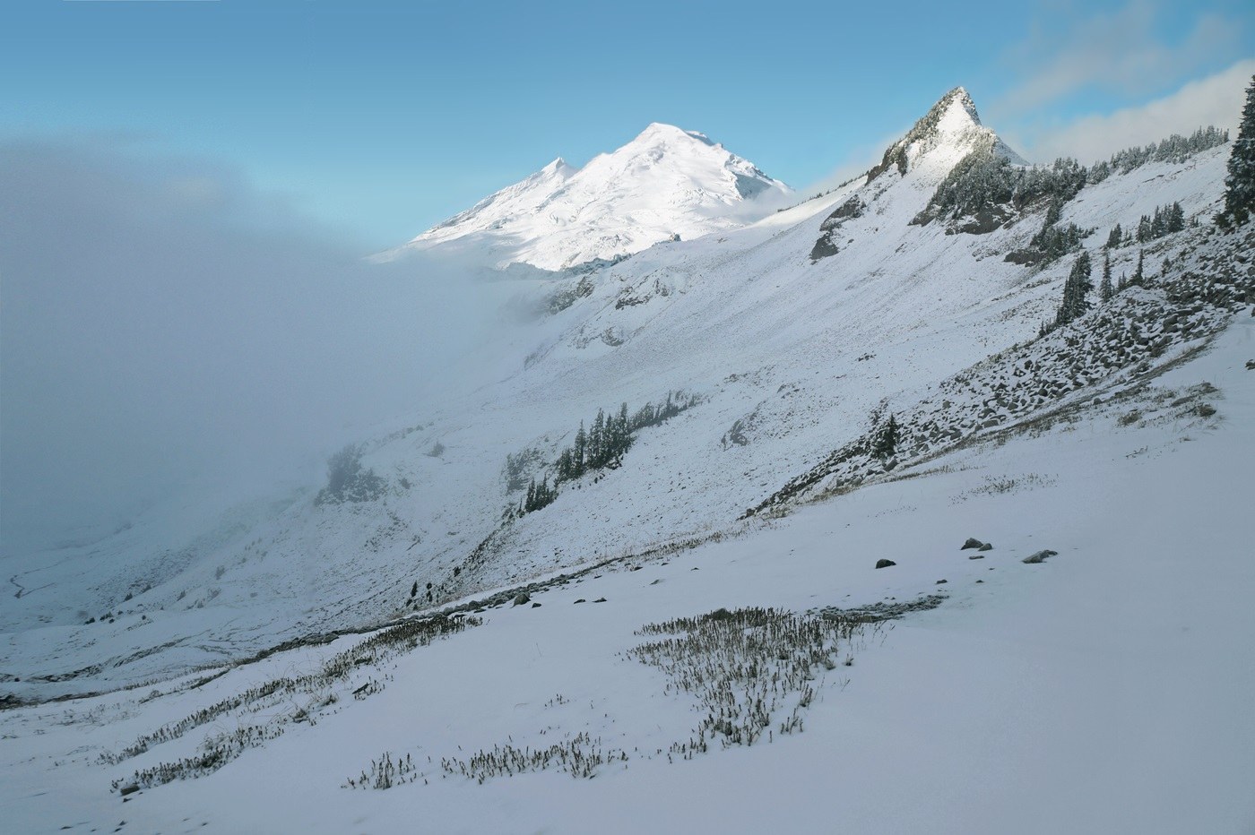 Since the seasonal closure started last week, the hike began at the lower parking lot. I left the parking lot at about 5:40am when the temperature was a pleasant 35F with calm winds. The half moon almost directly overhead lit up the road (which I used both up and down rather than the Wild Goose side trail) to Artist Point so well that I did not use any lights. The first snow of note started around 4500 feet, around the Lake Ann trailhead elevation. It was only about a half inch to an inch all the way to the Lake loop junction. Upon descent into the Ptarmigan realm, snow increased to about 3-4 inches all the way to the Camp Kiser overlook and was perfect for hiking (with poles and traction). Weather started out nice with lots of beautiful light play during sunrise and through all the fogbanks. At around 10:30am, what at first seemed like another fog bank rolled in over Camp Kiser. But, it turned into a light to moderate snow storm which I was in all the way back to Artist Point. The trail from Artist Point to the Lake Loop trail was fairly heavily tracked. The rest of the Ptarmigan route was not broken at all. About two-thirds of the way to my turnaround point was a group of five white Ptarmigans which were sometimes calling loudly with their odd sounds.