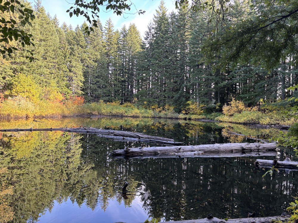 After one and a half miles, the road crosses Paradise Trail #124, which we turned south on to visit Rock Point, where I decided against a steep rock-and-grass-and-dirt scramble to the top. After Rock Point we returned north on the Paradise Trail. Branches on top of branches lie across much of the tread, evidence of its infrequent use. But the yellowing leaves of vanilla leaf brightened the understory, and bracken fern turned exposed hillsides a golden-yellow. Just past where the trail crosses FR 6401, a beautiful small, unnamed lake appeared below the trail. Ancient logs floated along the shore, which was bordered by fall foliage shining bright in the sunlight. After crossing the high point of Paradise Hills, the trail entered a former clearcut, where it became rather sketchy. GPS showed the trail in an impossible location. It seems as though a new route, not shown on GPS maps, was half-heartedly created through the clearcut, and subsequent growth of trees and shrubs have obscured much of that faint path. A little bushwacking got us through to Forest Road 234, where a more evident Paradise Trail picked up again, leading us to its terminus at a junction with Paradise Hills Trail #153. From there we returned to the trailhead, completing 12.8 miles with 2,439 feet elevation gain.