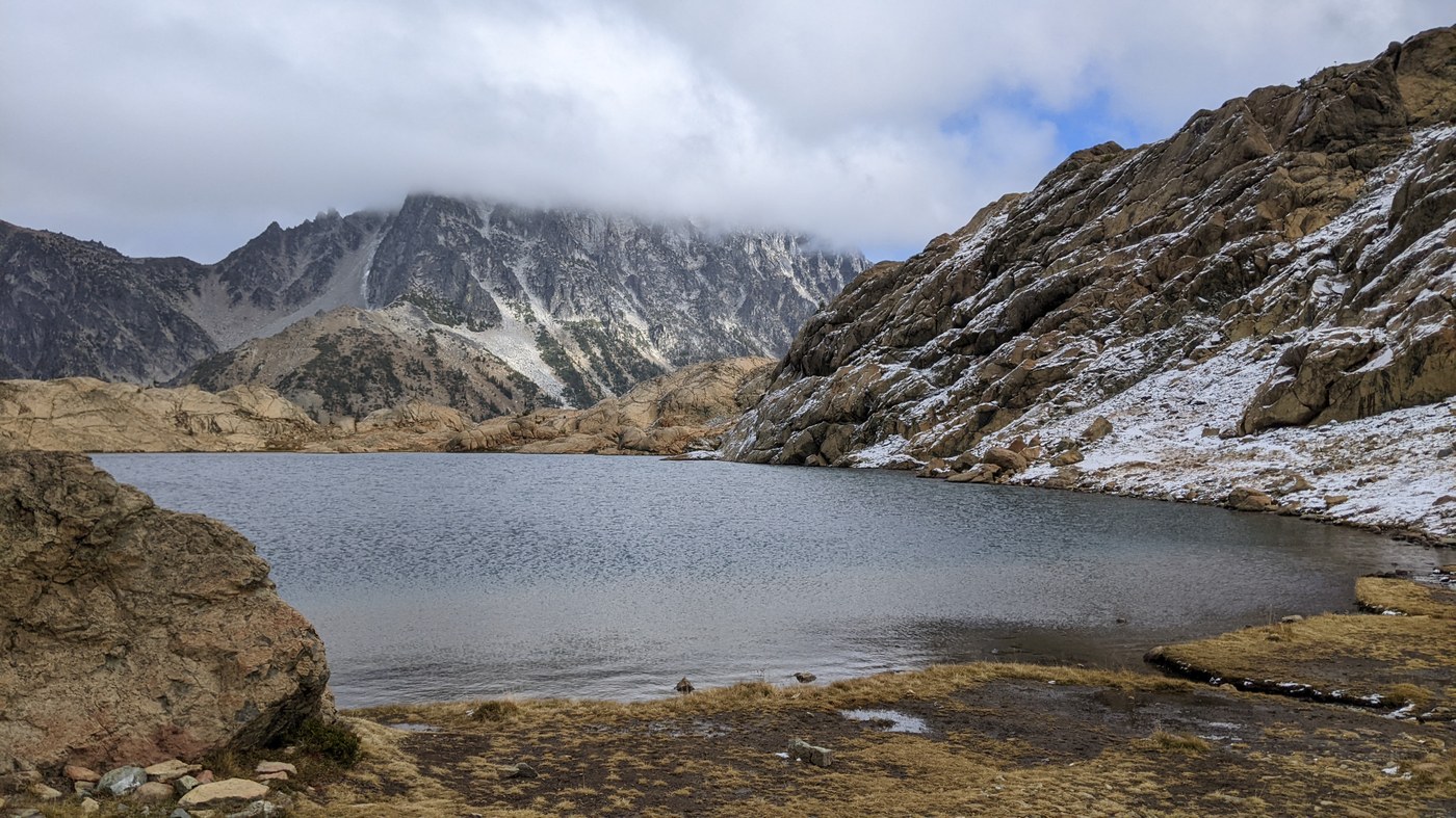 WEATHER. The season is turning. A happy dose of larch gold remains, though it is mostly gone. Stuart mostly (and entirely in our time at Lake Ingalls) resembled this hiker: head lost in the clouds. Temp on arrival at the TH lot was 27 degrees. Later varied from lower to upper thirties. Still some ice on parts of the Headlight Basin creek in late afternoon. Very pleasant, apart from the cold wind reminders of mountain weather. There were periods above freezing with many snow flecks dropping from above. Big cloud cover over Ingalls Peak, threatening or not? With good weather and longer daylight, excursions up around Ingalls Peak would have tempted. Not this day. My friend has been out the "trail" on the left side of the lake (as you approach the lake) is doable but not very nice (though it connects you to more). So on this day at the lake, we just ... chilled ...