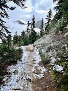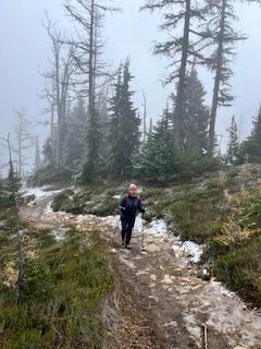 We missed the Larch colors, for the most part, but the hike was still beautiful with ice and snow on the trees and the clouds coming and going.