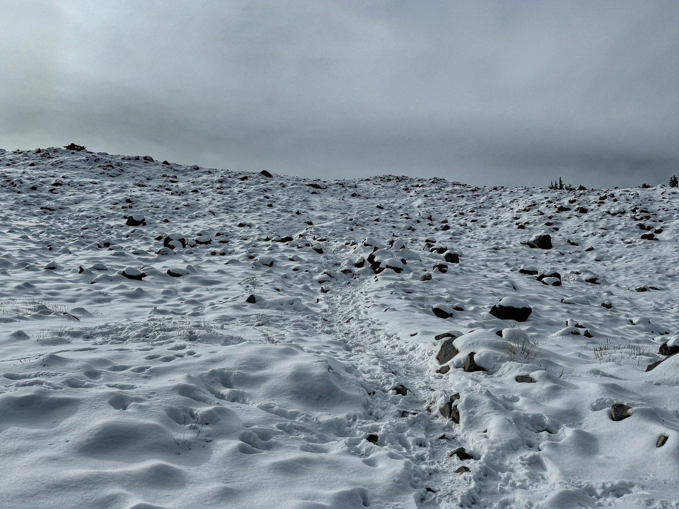 Past the lakes, heading uphill towards the junction with the Ptarmigan Ridge trail, the snow became continuous and I put on my spikes. It looked like many people had not been wearing spikes, but given the amount of ice also present you’d have to watch your footing carefully. The Ptarmigan Ridge trail will likely be entirely snow covered after this weekend, as it had very few bare patches yesterday. I passed a few backcountry skiers heading out hoping to find enough snows for a few turns.